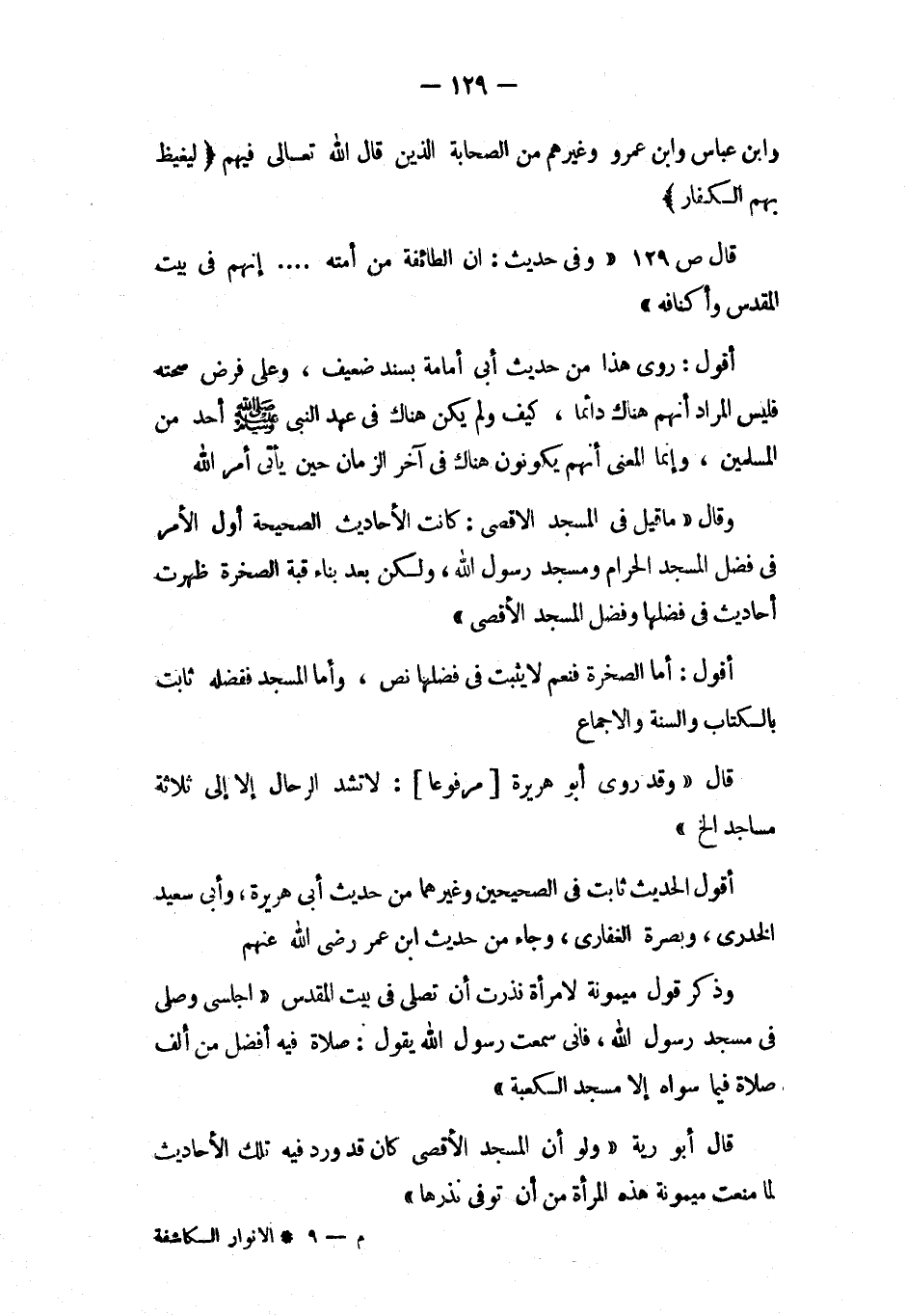 قال ص129 «وفي حديث: أن الطائفة من أمته.. إنهم في بيت المقدس وأكنافه»