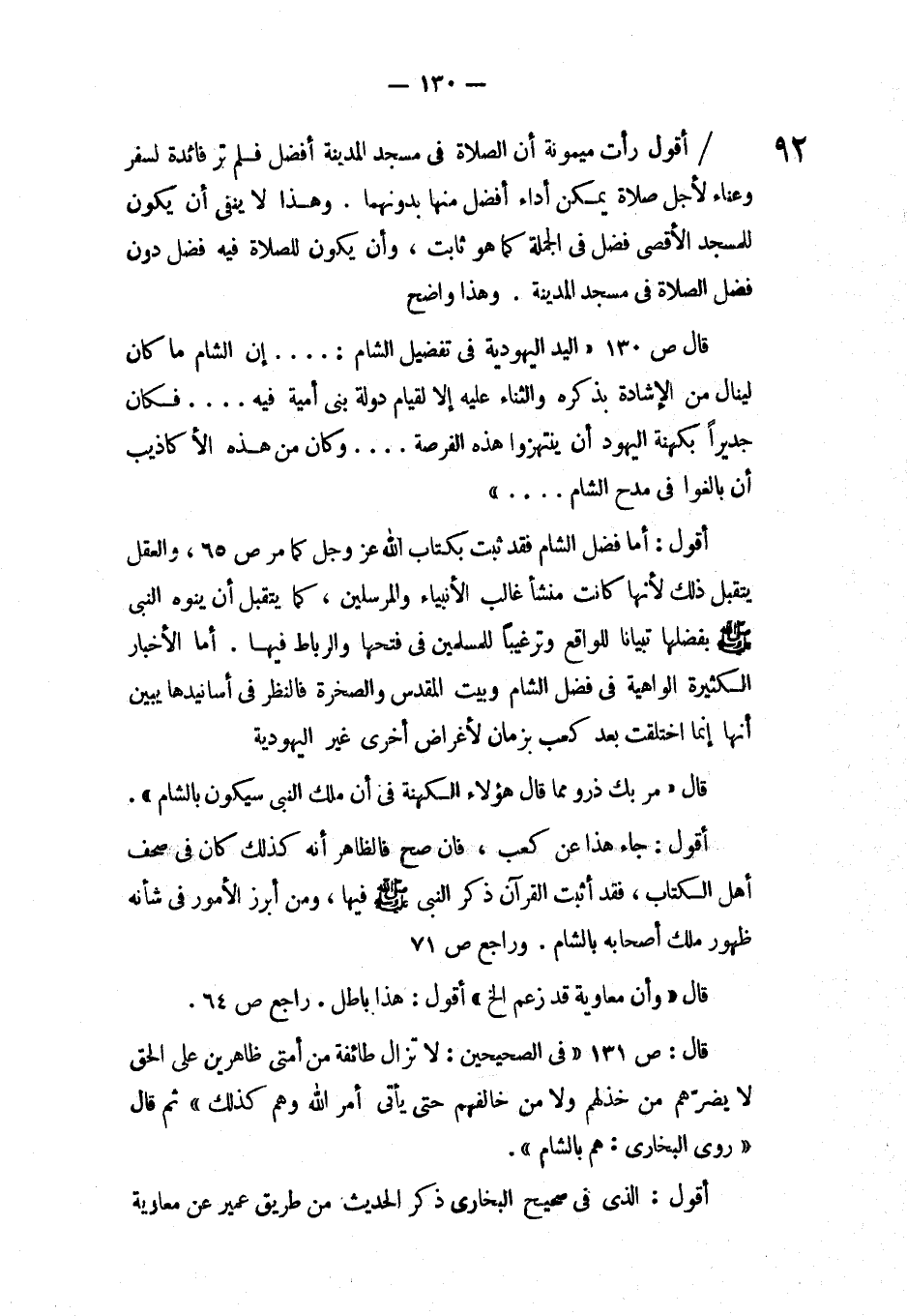 قال ص130 «اليد اليهودية في تفضيل الشام:.. إن الشام ما كان لينال من الإشادة بذكره والثناء عليه إلا لقيام دولة بني أمية فيه.. فكان جديراً بكهنة اليهود أن ينتهزوا الفرصة ... وكان من هذه الأكاذيب أن بالغوا في مدح الشام»