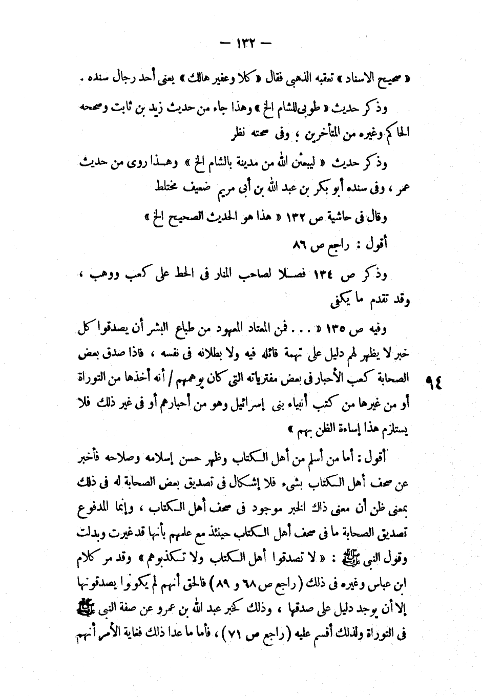 أقول: أما من أسلم من أهل الكتاب وظهر حسن إسلامه وصلاحه فأخبر عن صحف أهل الكتاب بشيء فلا إشكال في تصديق بعض الصحابة له في ذلك بمعنى ظن أن معنى ذاك الخبر موجود في صحف أهل الكتاب، وإنما المدفوع تصديق الصحابة ما في صحف أهل الكتاب حينئذ مع علمهم بأنها قد غيرت وبدلت وقول النبي صلى الله عليه وسلم: «لا تصدقوا أهل الكتاب ولا تكذبوهم» وقد مر كلام ابن عباس وغيره في ذلك (راجع ص68و 89) فالحق أنهم لم يكونوا يصدقونها إلا أن يوجد دليل على صدقها، وذلك كخبر عبد الله بن عمرو عن صفة النبي صلى الله عليه وسلم في التوراة ولذلك أقسم عليه (راجع ص71) ، فأما ماعدا ذلك فغاية الأمر أنهم