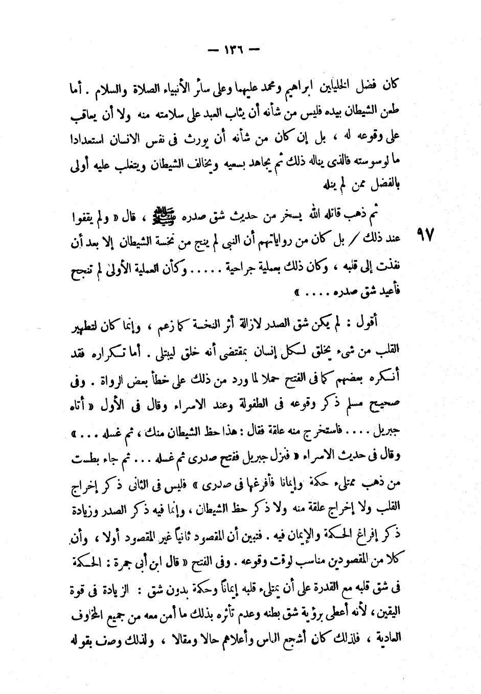 أقول: لم يكن شق الصدر لا زالة أثر النخسة كما زعم، وإنما كان لتطهير القلب من شيء يخلق لكل إنسان بمقضتى أنه خلق ليبتلى، أما تكراره فقد أنكره بعضهم كما في الفتح حملاً لما ورد من ذلك على خطأ بعض الرواة، وفي صحيح مسلم ذكر وقوعه في الطفولة وعند الإسراء وقال في الأول «أتاه جبريل ... فاستخرج منه علقة فقال: هذا حظ الشيطان منك، ثم غسله ... » وقال في حديث الإسراء «فنزل جبريل ففتح صدري ثم غسله ... ثم جاء بطست من ذهب ممتلئ حكمة وإيمانا فأفرغها في صدري» فليس في الثاني ذكر إخراج القلب ولا إخراج علقة منه، ولا ذكر حظ الشيطان، وإنما فيه ذكر الصدر وزيادة ذكر إفراغ الحكمة والإيمان فيه، فتبين أن المقصود ثانياً غير المقصود أولاً، وأن كلا من المقصودين مناسب لوقت وقوعه، وفي الفتح «قال ابن أبي جمرة: الحكمة في شق قلبه مع القدرة على أن يمتلئ قلبه إيماناً وحكمة بدون شق: الزيادة في قوة اليقين، لأنه أعطى برؤية شق بطنه وعدم تأثره بذلك ما أمن معه من جميع المخاوف العادية، فلذلك كان أشجع الناس وأعلاهم حالاً ومقالاً، ولذلك وصف بقوله