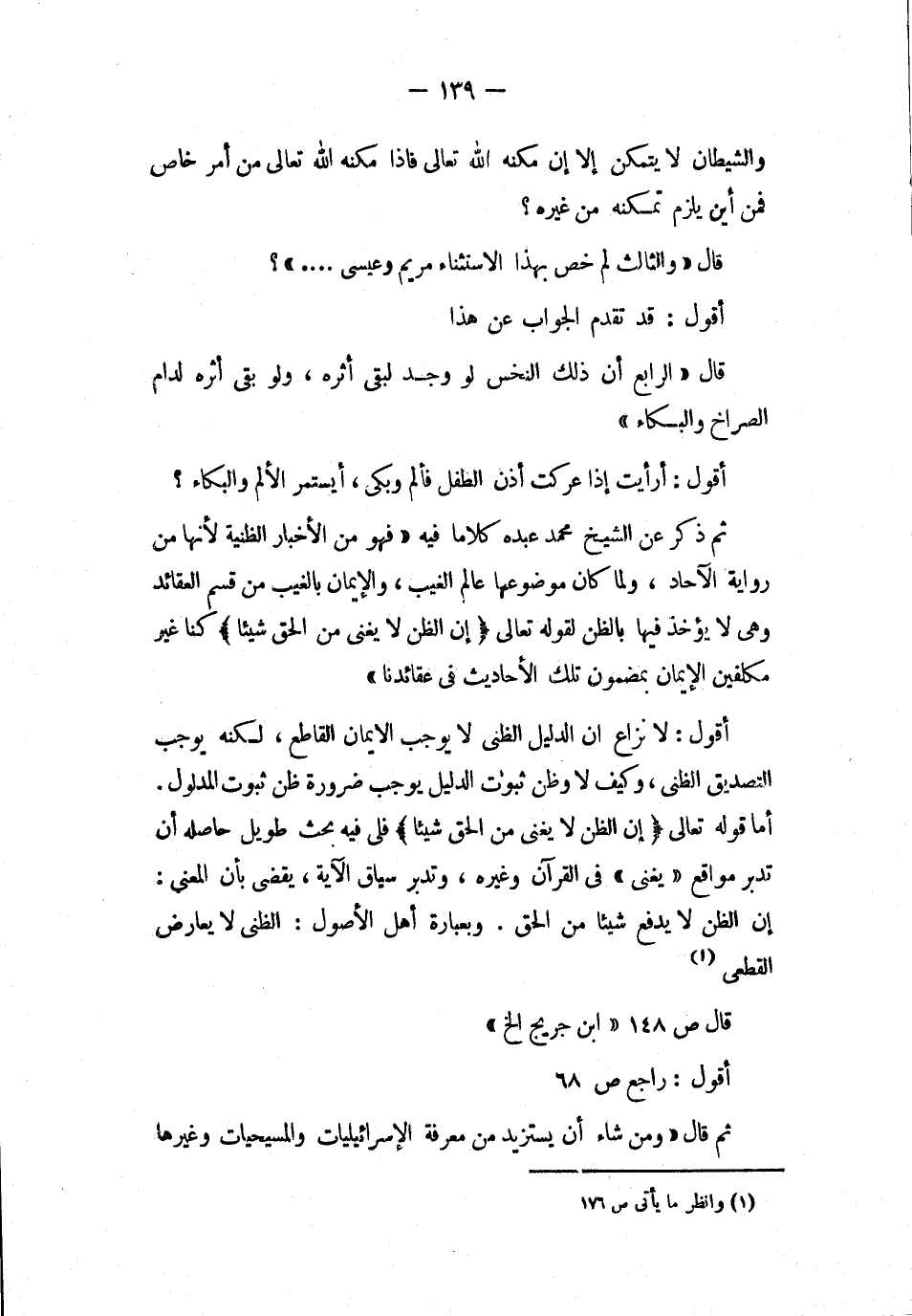 ثم ذكر عن الشيخ محمد عبده كلاماً فيه «فهو من الأخبار الظنية لأنها من رواية الآحاد، ولما كان موضوعها عالم الغيب، والإيمان بالغيب من قسم العقائد وهي لا يؤخذ فيها بالظن لقوله تعالى «إن الظن لا يغني من الحق شيئا» كنا غير مكلفين الإيمان بمضمون تلك الأحاديث في عقائدنا»