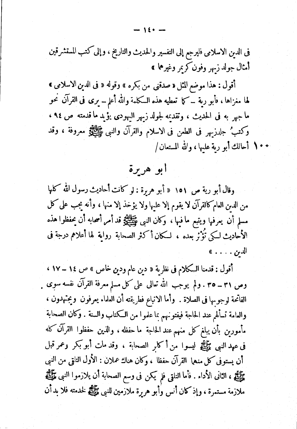 أقول: هذا موضع المثل «صدقني من بكره» وقوله «في الدين الإسلامي» لما مغزاها، فأبو رية - كما تعطيه هذه الكلمة والله أعلم - يرى في القرآن نحو ماجهر به من الحديث، وتقديمه لجولدبهز اليهودي يؤيد ما قدمته ص94، وكتب جلدزيهر في الطعن في الإسلام والقرآن والنبي صلى الله عليه وسلم معرفة، وقد أحالك أبو رية عليها، والله المستعان /