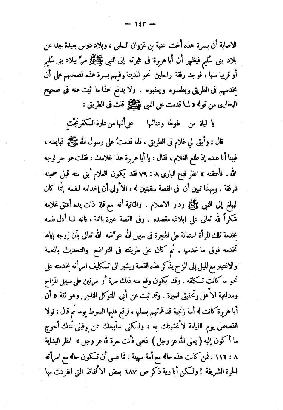 قال: وأبقى لي غلام في الطريق، فلما قدمت على رسول الله صىل الله عليه وسلم فبايعته، فبنينا أنا عنده إذ طلع الغلام، فقال: يا أبا هريرة هذا غلامك، فقلت هو حر لوجه الله. فأعتقه» انظر فتح الباري 79:8 فقد يكون الغلام أبق منه قبل صحبته المرفقة، وبهذا تبين أن في القصة منقبتين له ن الأولى أن إخدامه لنفسه إنما كان ليبلغ إلى النبي صلى الله عليه وسلم ودار الإسلام، والثانية أنه مع قد ذات يده أعتق غلامه، شكراً لله تعالى على إبلاغه مقصدة، وفي القصة عبرة بالغة، فإنه لما أذل نفسه بخدمة تلك المرأة استعانة على الهجرة في سبيل الله عوضه الله تعالى بأن زوجه إياها تخدمه فوق ما خدمها، ثم كان على طريقته في التواضع والتحديث بالنعمة والاعتبار مع الميل إلى المزاح يذكر هذه القصة ويشير إلى تكليف امرأته بخدمته على نحو ما كانت تكلفه. وقد يكون وقع منه ذلك مرة أو مرتين على سبيل المزاح ومداعبة الأهل وتحقيق العبرة، وقد ثبت عن أبي المتوكل الناجي وهو ثقة «أن أبا هريرة كانت له أمة زنجية قد غمتهم بعملها، فرفع عليها السوط يوماً ثم قال: لولا القصاص يوم القيامة لأغشيتك به، ولكني سأبيعك ممن يوفيني ثمنك أحوج ما أكون إليه (يعني الله عز وجل) اذهبي فأنت حرة لله عز وجل» انظر البداية 112:8. فمن كانت هذه حاله مع أمة مهينة، فما عسى أن تكون حاله مع امرأته الحرة الشريفة؟ ولكن أبا رية ذكر ص187 بعض الألفاظ التي انفردت بها