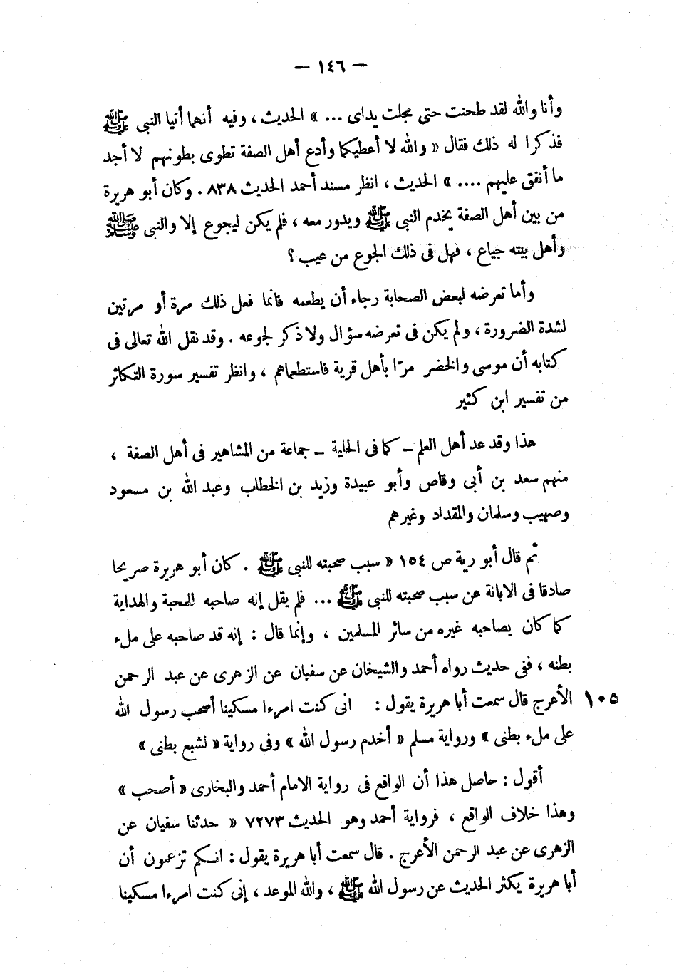 وأنا والله لقد طحنت حتى مجليت يداي ... » الحديث، وفيه أنهما أنيا النبي صلى الله عليه وسلم فذكرا له ذلك فقال «والله لا أعطيكما وأدع أهل الصفة تطوى بطونهم لا أجد ما أنفق عليهم ... » الحديث، انظر مسند أحمد الحديث 838. وكان أبو هريرة من بين أهل الصفة يخدم النبي صلى الله عليه وسلم ويدور معه، فلم يكن ليجوع إلا والنبي صلى الله عليه وسلم وأهل بيته جياع، فهل في ذلك الجوع من عيب؟