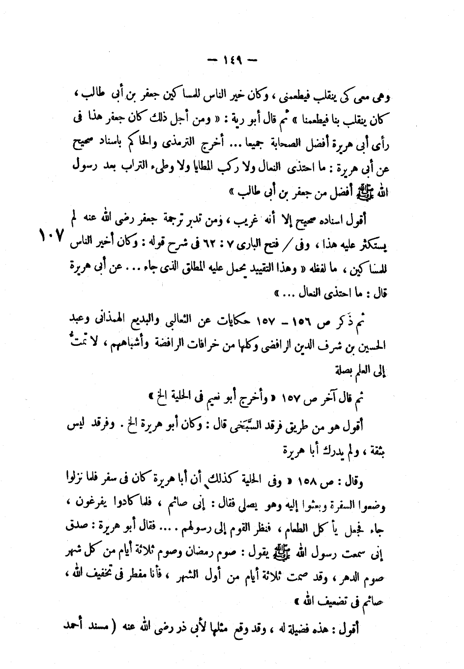 وقال: ص158 «وفي الحلية كذلك أن أبا هريرة كان في سفر فلما نزلوا وضعوا السفرة وبعثوا إليه وهو يصلي فقال: إني صائم، فلما كادوا يفرغون، جاء فجعل يأكل الطعام، فنظر القوم إلى رسولهم ... فقال أب هريرة: صدق إني سمعت رسول الله صلى الله عليه وسلم يقول: صوم رمضان وصوم ثلاثة أيام من كل شهر صوم الدهر، وقد صممت ثلاثة أيام من أول الشهر، فأنا مفطر في تخفيف الله، صائم في تضعيف الله»