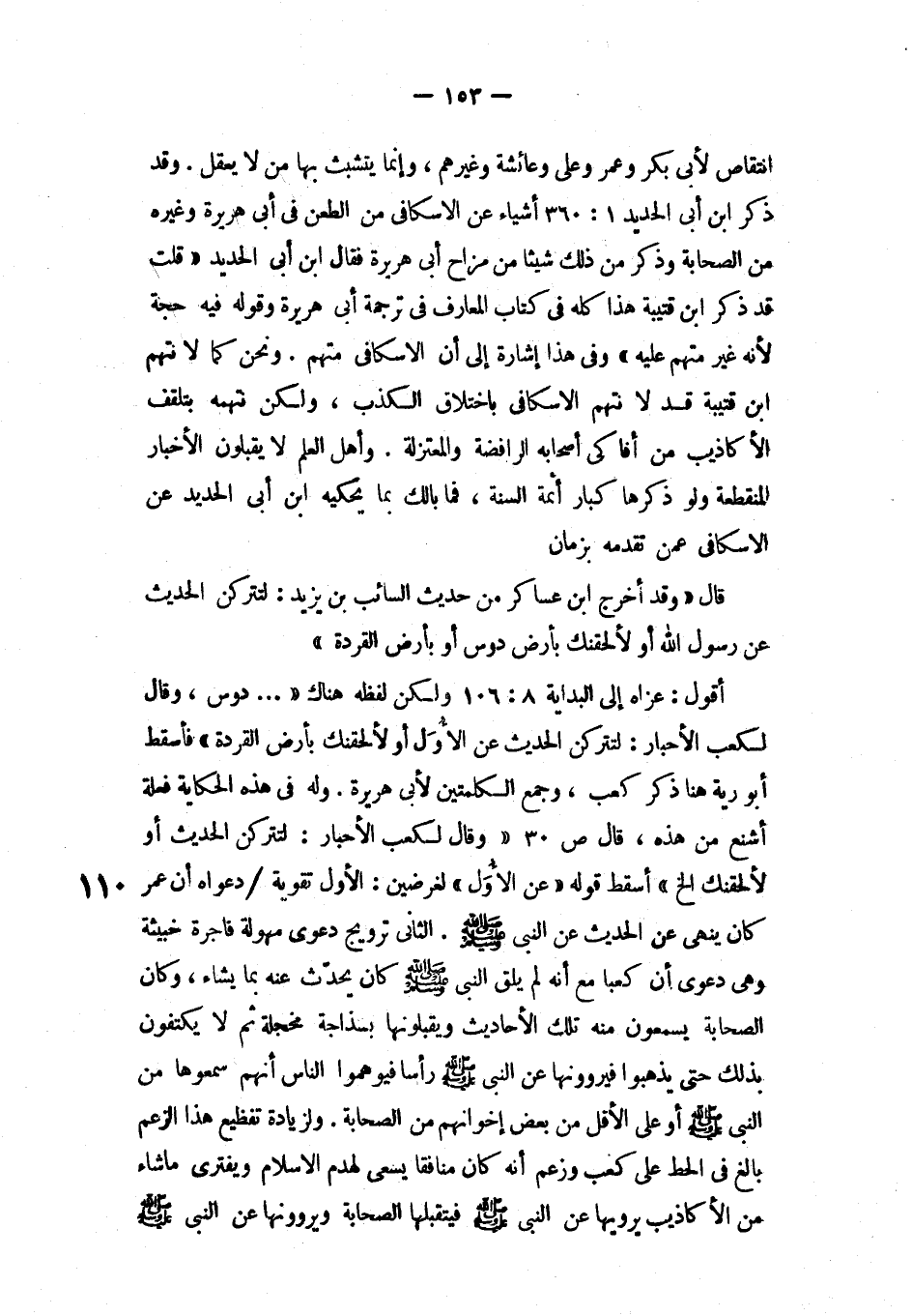 أقول: عزاه إل البداية 106:8 ولكن لفظه هناك « ... دوس، وقال لكعب الأحبار: لتتركن الحديث عن الأول أو لألحقنك بأرض القردة» فأسقط أبو رية هنا ذكر كعب، وجمع الكلمتين لأبي هريرة وله في هذه الحكاية فعلة أشنع من هذه. قال ص30 «وقال لكعب الأحبار: لتتركن الحديث أو لألحقنك الخ» أسقط قوله «عن الأول» لغرضين: الأول تقوية / دعواه أن عمر كان ينهى عن الحديث عن النبي صلى الله عليه وسلم. الثاني ترويج دعوى مهولة فاجرة خبيثة وهي دعوى أن كعباً مع أنه لم يلق النبي صلى الله عليه وسلم كان يحدث عنه بما يشاء، وكان الصحابة يسمعون منه تلك الأحاديث ويقبلونها بمذاحة مخجلة ثم لا يكتفون بذلك حتى يذهبوا فيروونها عن النبي صلى الله عليه وسلم رأساً فيوهموا الناس أنهم سمعوها همن النبي صلى الله عليه وسلم أو على الأقل من بعض إخوانهم من الصحابة، ولزيادة تفظيع هذا الزعم بالغ في الحط على كعب وزعم أنه كان منافقاً يسعى لهدم الإسلام ويفترى ما شاء من الأكاذيب يرويها عن النبي صلى الله عليه وسلم فيتقبلها الصحابة ويروونها عن النبي صلى الله عليه وسلم