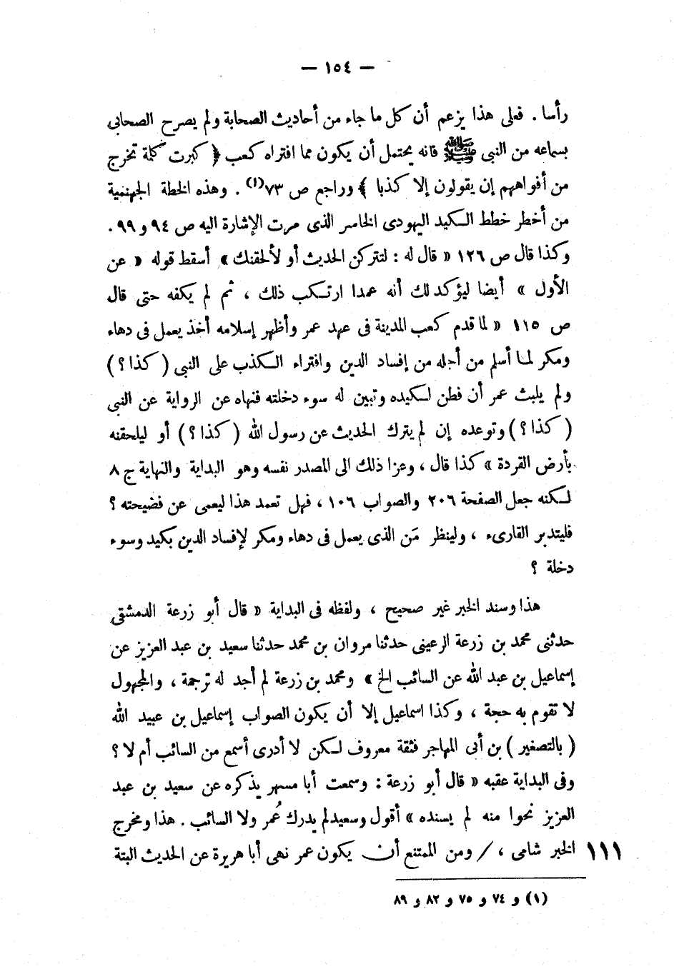 رأساً، فعلى هذا يزعم أن كل ما جاء من أحاديث الصحابة ولم يصرح الصحابي بسماعه من النبي صلى الله عليه وسلم فإنه يحتمل أن يكون مما افتراه كعب «كبرت كلمة تخرج من أفواههم أن يقولون إلا كذبا» وراجع ص73 (1) . وهذه الخطة الجهنمية من أخطر تخطيط الكيد اليهودي الخاسر الذي مرت الإشارة إليه ص49و 99.وكذا قال ص126 «قال له: لتتركن الحديث أو لألحقنك» أسقط قوله «عن الأول» أيضاً ليؤكد لك أنه عمداً ارتكب ذلك. ثم لم يكفه حتى قال ص115 «لما قدم كعب المدينة في عهد عمر وأظهر إسلامه أخذ يعمل في دهاء ومكر لما أسلم من أجله من إفساد الدين وافتراء الكذب على النبي (كذا؟) ولم يلبث عمر أن فطن لكيده وتبين له سوء دخلته فنهاه عن الرواية عن النبي (كذا؟) وتوعده إن لم يترك الحديث