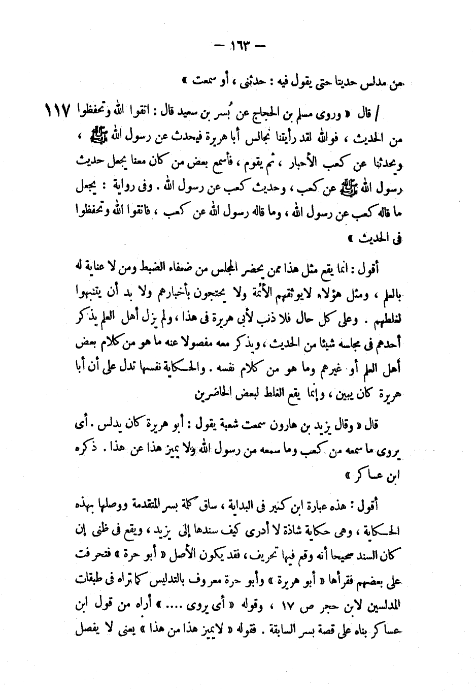 / قال «وروى مسلم بن الحجاج عن بسر بن سعيد قال: اتقوا الله وتحفظوا من الحديث، فوالله لقد رأيتنا نجالس أبا هريرة فيحدث عن رسول الله صلى الله عليه وسلم، ويحدثنا عن كعب الأحبار، ثم يقوم، فأسمع بعض من كان معنا يجعل حديث رسول الله صلى الله عليه وسلم عن كعب، وحديث كعب عن رسول الله، وفي رواية: يجعل ما قاله كعب عن رسول الله، وما قاله رسول الله عن كعب، فاتقوا الله وتحفظوا في الحديث»