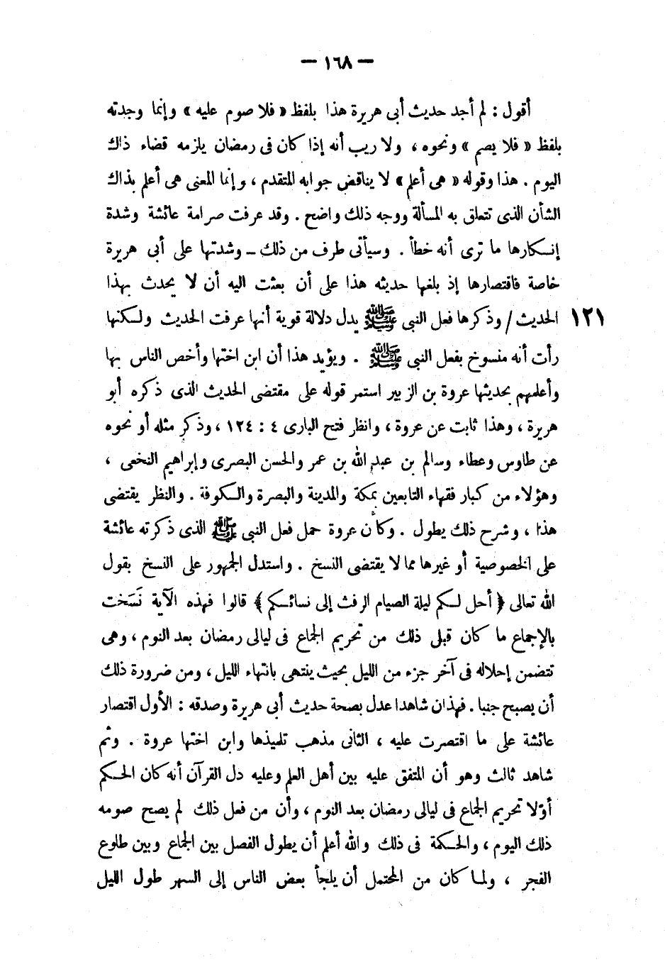 أقول: لم أجد حديث أبي هريرة هذا بلفظ «فلا صوم عليه» وإنما وجدته بلفظ «فلا يصم» ولا ريب أنه كان في رمضان يلزمه قضاء ذاك اليوم. هذا وقوله «هي أعلم» لا يناقض جوابه المتقدم، وإنما المعنى هي أعلم بذاك الشأن الذي تتعلق به المسألة ووجه ذلك واضح، وقد عرفت صرامة عائشة وشدة إنكارها ماترى أنه خطأ، وسيأتي طرف من ذلك - وشدتها على أبي هريرة خاصة فاقتصارها إذ بلغها حديثه هذا على أن بعثت إليه أن لا يحدث بهذا الحديث / وذكرها فعل النبي صلى الله عليه وسل يل دلالة قوية أنها عرفت الحديث ولكنها رأت أنه منسوخ بفعل النبي صلى الله عليه وسلم. ويؤيد هذا أن ابن اختها وأخص الناس بها وأعلمهم بحديثها عن عروة بن الزبير استمر قوله عى مقتضى الحديث الذي ذكره أبو هريرة، وهذا ثابت عن عروة، وانظر فتح الباري 14:4، وذكر مثله أو نحوه، وهؤلاء من كبار فقهاء التابعين بمكة والمدينة والبصرة والكوفة، والنظر يقتضي هذا، وشرح ذلك يطول، وكأن عروة حمل فعل النبي صلى الله عليه وسلم الذي ذكرته عائشة على الخصوصية أو غيرها مما لا يقتضي النسخ، واستد الجمهور على النسخ بقول الله تعالى (أحل لكم ليلة الصيام الرفث إلى نسائكم) قالوا الآية نسخت بالإجماع ما كان قبل ذلك من تحريم الجماع في ليالي رمضان بعد النوم وهي تتضمن إحلاله في آخ جزء من الليل بحيث ينتهي بانتهاء الليل، ومن ضرورة ذلك أن يصبح جنباً فهذان شاهدان عدل بصحة حديث أبي هريرة وصدقه: الأول اقتصار عائشة على ما اقتصرت عليه، الثاني مذهب تلميذها وابن اختها عروة، وثم شاهد ثالث وهو أن المتفق عليه بين أهل العلم وعليه دل القرآن أنه كان الحكم أولاً تحريم الجماع في ليالي رمضان بعد النوم، وأن من فعل ذلك لم يصح صومه ذلك اليوم، والحكمة من ذلك والله أعلم أن يطول الفصل بني الجماع وبين طول الفجر، ولما كان من المحتمل أن يلجأ بعض الناس إلى السهر طول الليل