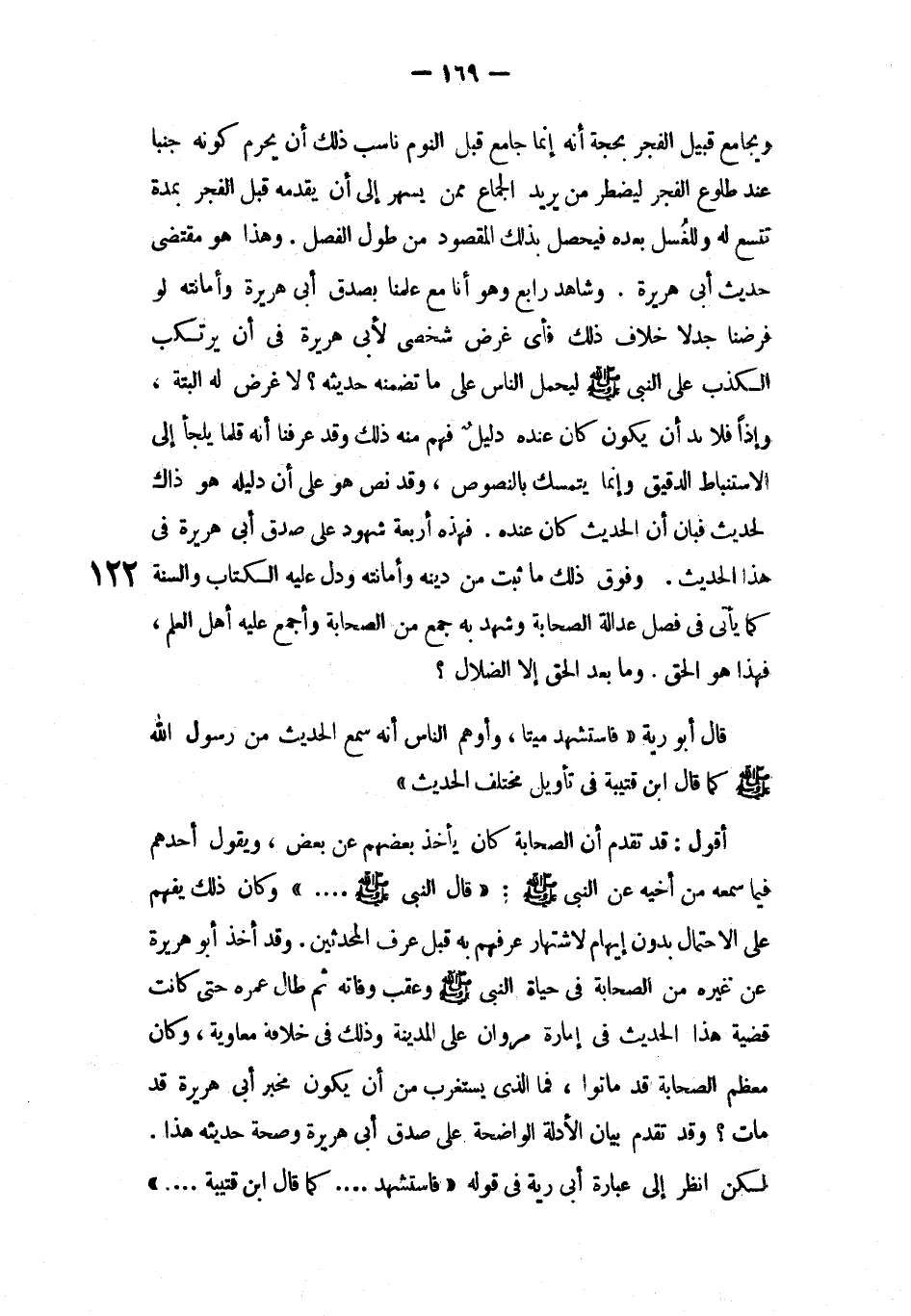 ويجامع قبيل الفجر بحجة أنه جامع قبل النوم ناسب ذلك أنه يحرم كونه جنباً عند طلوع الفجر ليضطر من يريد الجماع ممن يسهر إلى أن يقدمه قبل الفجر بمدة تتسع له وللغسل بعده فيحصل بذلك المقصود من طول الفصل، وهذا هو مقتضى حديث أبي هريرة، وشاهد رابع وهو أنا مع علمنا بصدق أبي هريرة وأمانته لو فرضنا جدلاً خلاف ذلك فأي غرض شخصي لأبي هريرة في أن يرتكب الكذب على النبي صلى الله عليه وسلم ليحمل الناس على ما تضمنه حديثه؟ لا غرض له البتة، وإذاً فلابد أن يكون كان عنده دليل فهم منه ذلك وقد عرفنا أن قلماً يلجاً إلى الاستنباط الدقيق وإنما يتمسك بالنصوص، وقد نص هو على أن دليله هو ذاك الحديث فبان أن الحديث كما عنده، فهذه أربعة شهود على صدق أبي هريرة في هذا الحديث، وفوق ذك ماثبت مندينه وأمانته ودل عليه الكتاب والسنة كما يأتي في فضل عدالة الصحابة شهد به جمع من الصحابة وأجمع عليه أهل العلم، فهذا هو الحق، وماذا بعد الحق إلا الضلال؟