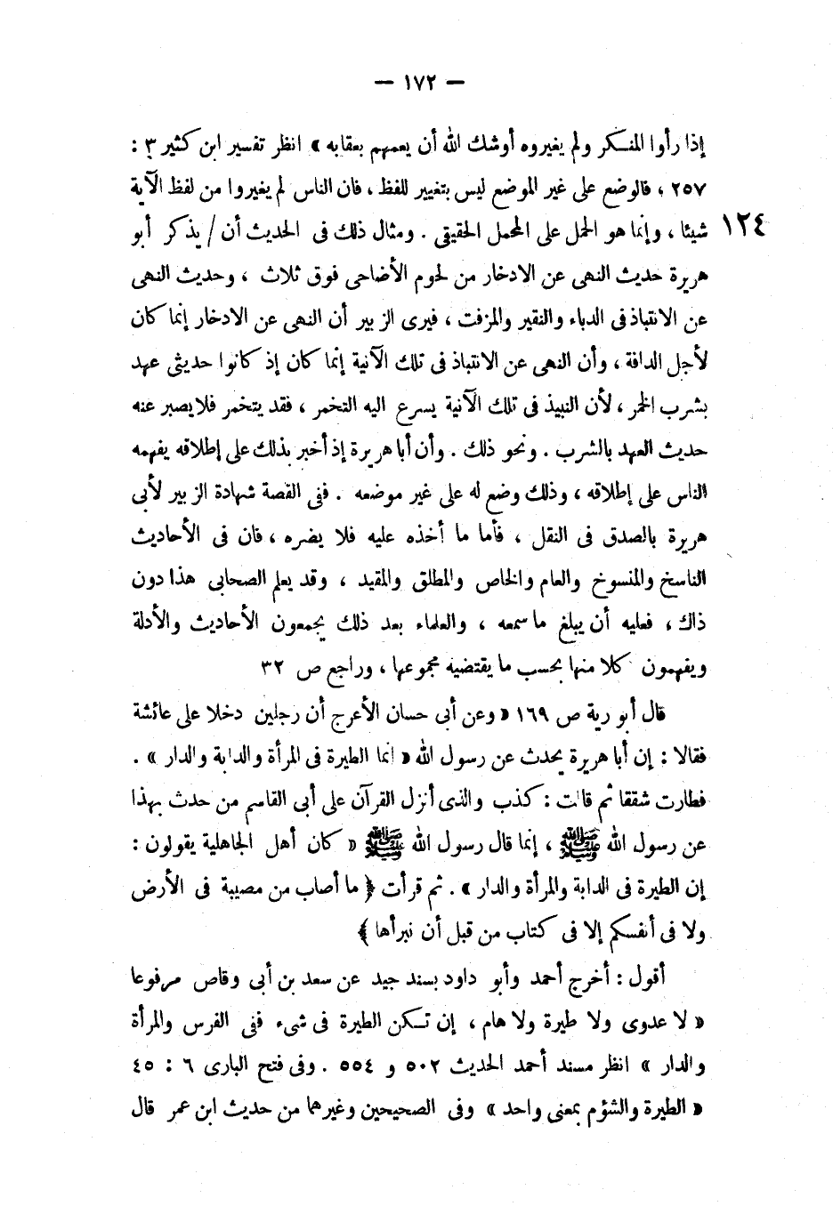 قال أبو رية ص 169 «وعن أبي حسان الأعرج أن رجلين دخلا على عائشة فقالا: إن أبا هريرة يحدث عن رسول الله ((إنما الطيرة في المرأة والدابة والدار)) . فطارت شققا ثم قالت: كذب والذي أنزل على القرآن على أبي القاسم من حدث بهذا عن رسول الله صلى الله عليه وسلم، إنما قال رسول الله صلى الله وعليه وسلم ((كان أهل الجاهلية يقولون: إن الطيرة في الدابة والمرأة والدار)) . ثم قرأت ((ما أصاب من مصيبة في الأرض ولا في أنفسكم إلا في كتاب من قبل أن نبرأها)) .