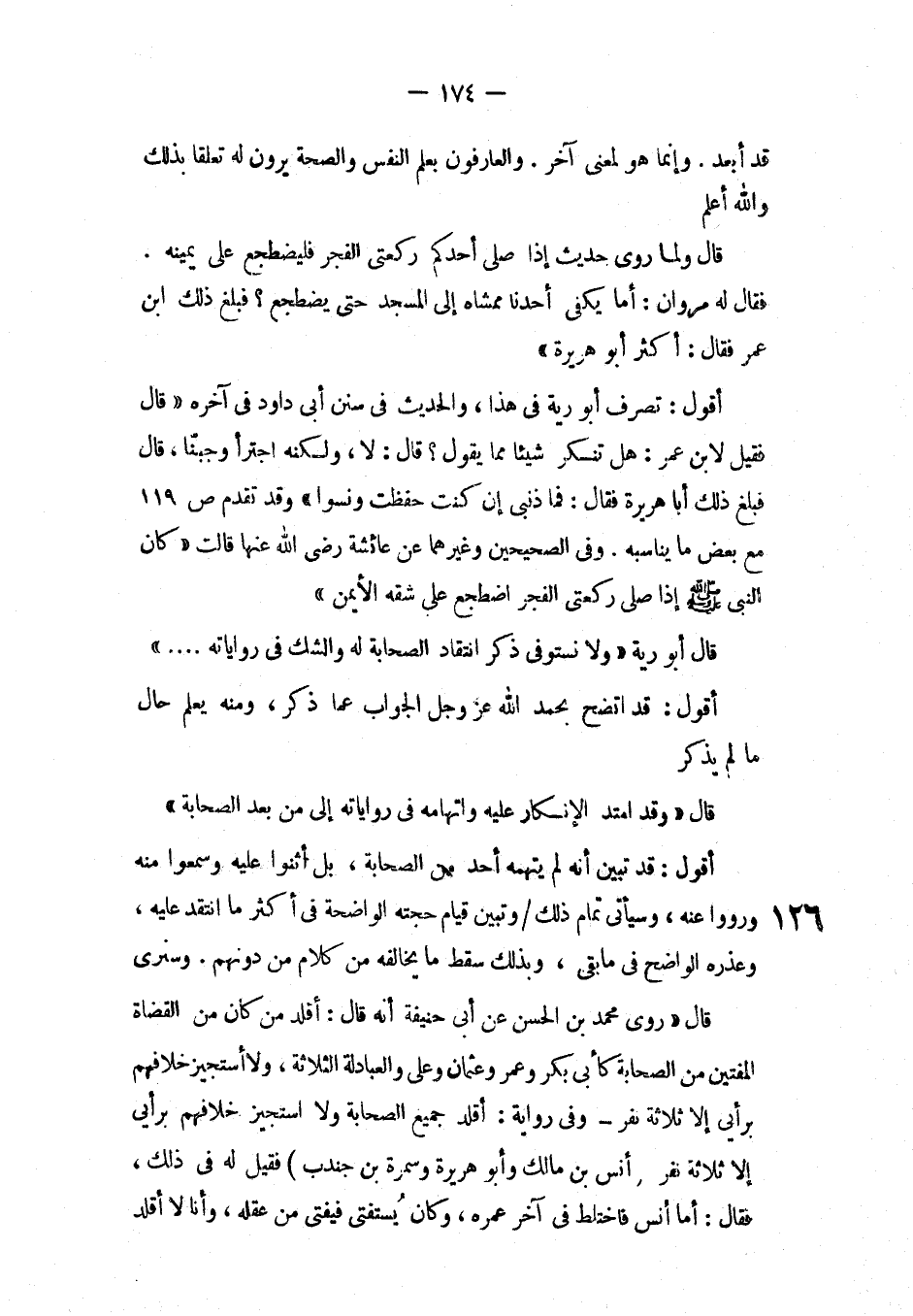 أقول: تصرف أبو رية في هذا، والحديث في سنن أبي داود في آخره «قال فقيل لابن عمر: هل تنكر شيئاً مما يقول؟ قال: لا، ولكنه اجترأ وجبا، قال فبلغ ذلك لأبي هريرة فقال: ما ذنبي إن كنت حفظت ونسوا» وقد تقدم ص119 مع بعض ما يناسبه. وفي الصحيحين وغيرهما من حديث عائشة رضي الله عنه قالت «كان النبي صلى الله عليه وسلم إذا صلى ركعتي الفجر اضطجع على شقه الأيمن»