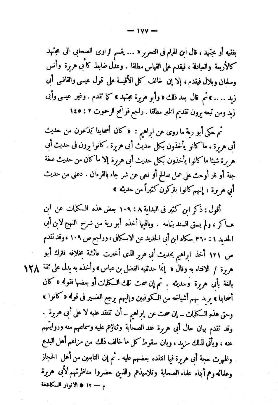 أقول: ذكره ابن كثير في البداية 109:8 بعض هذه الكلمات عن ابن عساكر، ولم يسق السند بتمامه، وباقيها أخذه أبو رية من شرح النهج لابن أبي الحديد 360:1 حكاه بن أبي الحديد عن الاسكافي، وراجع ص 109، وقد تقدم ص 121 أخذ إبراهيم بحديث أبي هريرة الذي أخبرت عائشة بخلافه فترك أبو هريرة / الافتاء به وقال «إنما حدثنيه الفضل بن عباس» وأخذ به يدل على ثقة بالغة بأبي هريرة وحديثه، ثم إن صحت تلك الكلمات أو بعضها فقوله «كان أصحابنا» يريد بهم أشياخه من الكوفيين وإليهم يرجع الضمير في قوله «كانوا» وحتى هذه الكلمات - إن صحت عن إبراهيم - أن تنتقد عليه لا على أبي هريرة. وقد تقدم بيان حال أبي هريرة عند الصحابة وثناؤهم عليه وسماعهم منه وروايتهم عنه، ويأتي لذلك مزيد، وبان سقوطه كل ماخالف ذلك من مزاعم أهل البدع وظهرت حجة أبي هريرة فيما انتقده بعضهم عليهم، ثم إن التابعين من أهل الحجاز وعلمائه وهم أبناء علماء الصحابة وتلاميذهم والذين حضروا مناظرتهم لأبي هريرة وعرفوا