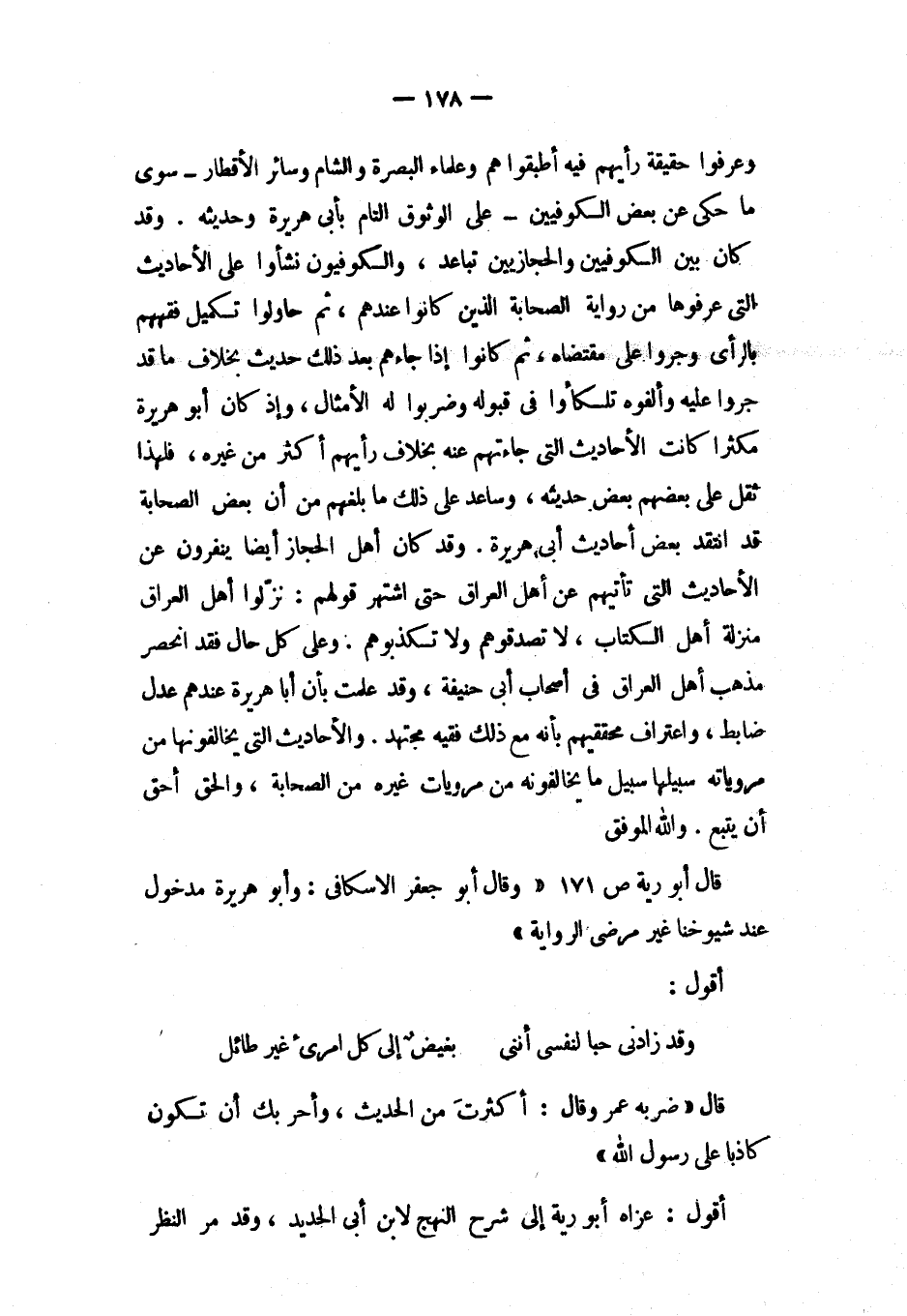 العراق في أصحاب أبي حنيفة، وقد علمت بأن أبا هريرة عندهم عدل ضابط، واعتراف محققيهم بأنه مع ذلك فقيه مجتهد، والأحاديث التي يخالفونها من مروياته سبيلها سبيل ما يخالفونه نم مرويات غيره من الصحابة، والحق أحق أن يتبع، والله الموفق