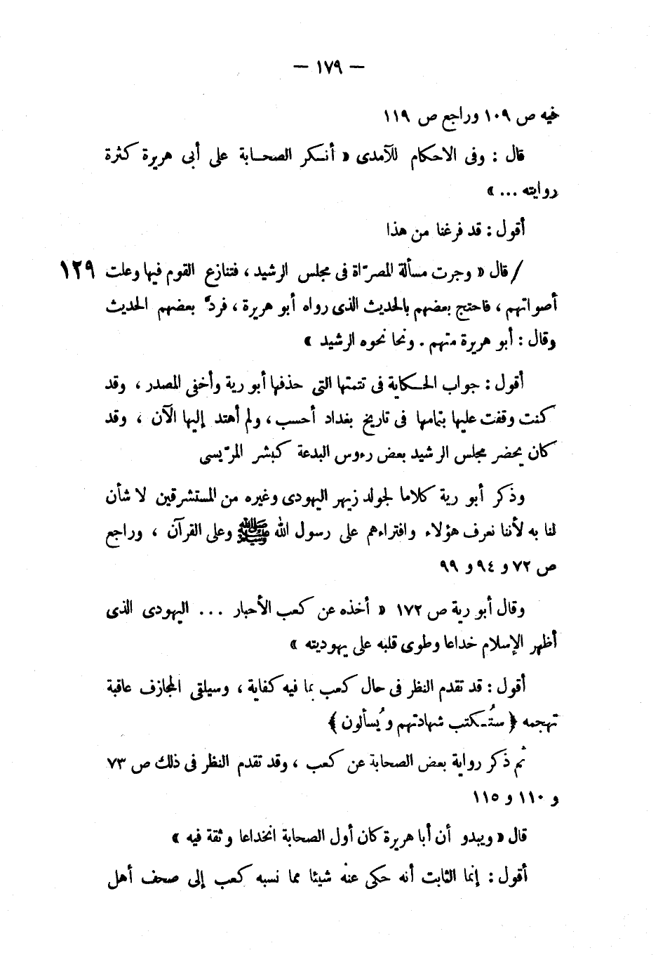 وذكر أبو رية كلاما لجولد زيهر اليهودي وغيره من المستشرقين لا شأن لنا به لأننا نعرف هؤلاء، وافتراءهم على رسول الله صلى الله عليه وسلم وعلى القرآن، وراجع ص 72و 94و 99