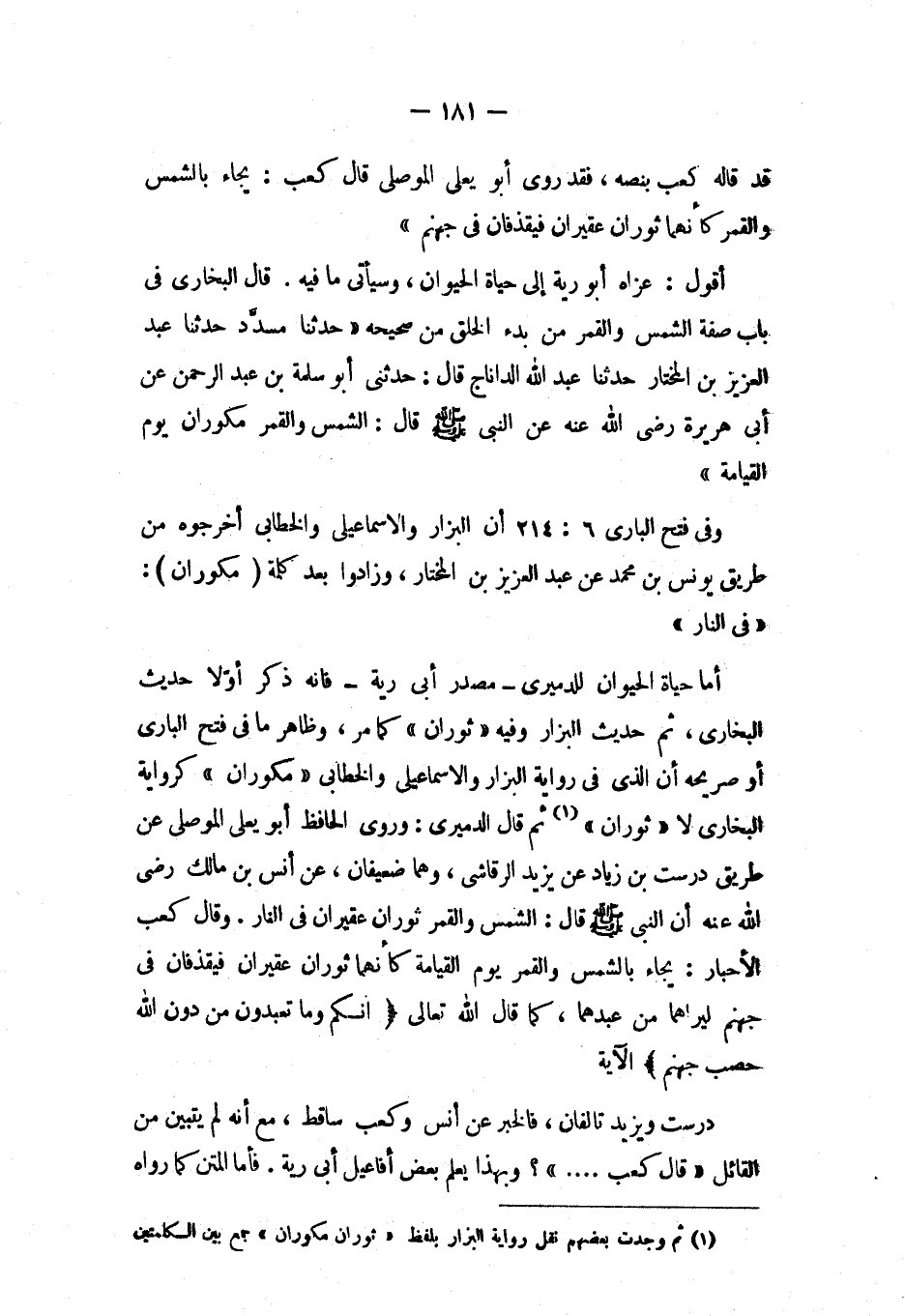 أقول: عزاه أبو رية إلى حياة الحيوان، وسيأتي ما فيه قال البخاري في باب صفة الشمس والقمر منبدء الخلق من صحيحه «حدثنا مسدد حدثنا عبد العزيز بن المختار حدثنا عبد الله الداناج قال: حدثني أبو سلمة بن عبد الرحمن عن أبي هريرة رضي الله عنه عن النبي صلى الله عليه وسلم قال: الشمس والقمر مكوران يوم القيامة»