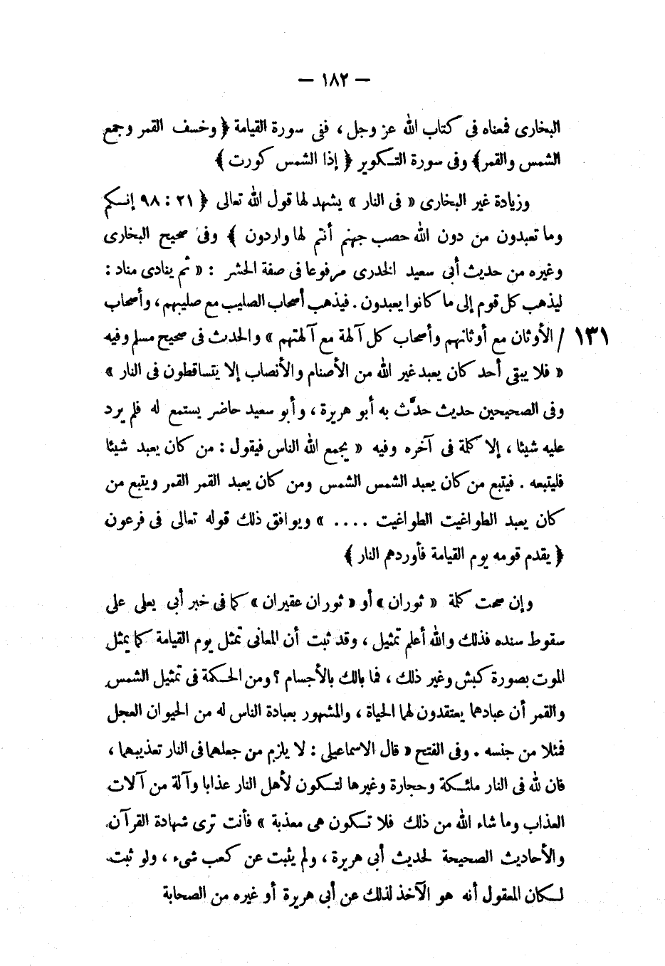 وإن صحت كلمة «ثوران» أو «ثوران عقيران» كما في خبر أبي يعلى على سقوط سنده فذلك والله أعلم تمثيل وقد ثبت أن المعاني تمثل يوم القيامة كما يمثل الموت بصورة كبش وغير ذلك، فما بالك بالأجسام؟ ومن الحكمة في تمثيل الشمس والقمر أن عبادهما يعتقدون لهما الحياة، والمشهور بعبادة الناس له من الحيوان العجل فمثلاً من جنسه، وفي الفتح «قال الإسماعيلي: لا يلزم من جعلها في النار تعذيبها، فإن لله في النار ملئكة وحجارة وغيرها لتكون لأهل النار عذاباً وآلة من آلات العذاب وما شاء الله من ذلك فلا تكون هي معذبة» فأنت ترى شهادة القرآن والأحاديث الصحيحة لحديث ابي هريرة، ولم يثبت عن كعب شيء، ولو ثبت لكان المعقول أنه هو الآخذ ذل عن أبي هريرة أو غيره من الصحابة