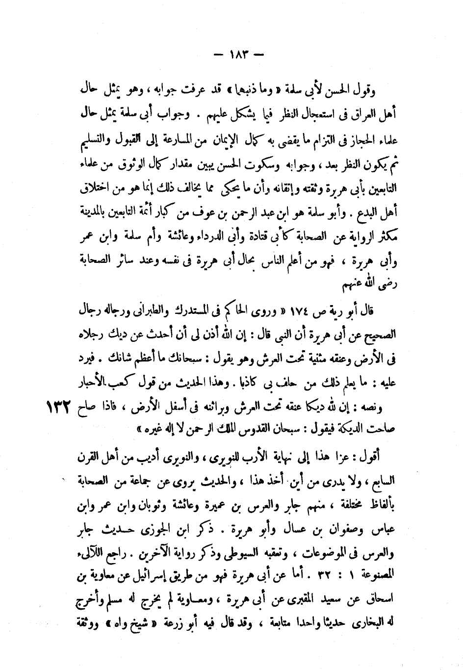وقول الحسن لأبي سلمة «وما ذنبهما» قد عرفت جوابه، وهو يمثل حاله أهل العراق في استعجال النظر فيما يشكل عليهم. وجواب أبي سلمة يمثل حال علماء الحجاز في التزام ما يقضي به كمال الإيمان من المسارعة إلى القبول والتسليم ثم يكون النظر بعد، وجوابه وسكوت الحسن يبين مقدار كما الوثوق من علماء التابعين بأبي هريرة وثقته وإتقانه وأن ما يحكي مما يخالف ذلك إنما هو من خلاف أهل البدع، وأبو سلمة هو ابن عبد الرحمن بن عوف من كبار أئمة التابعين بالمدينة مكثر الرواية عن الصحابة كأبي قتادة وأبي الدرداء وعائشة وأم سلمة وابن عمر وأبي هريرة، فهو من أعلم الناس بحال أبي هريرة في نفسه وعند سائر الصحابة رضي الله عنهم