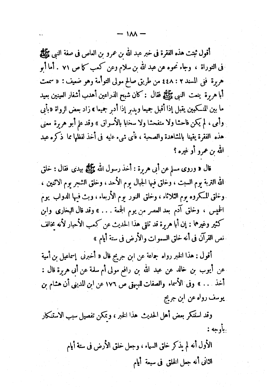 قال «وروى مسلم عن أبي هريرة: أخذ رسول الله صلى الله عليه وسلم بيدي فقال: خلق الله التربة يوم السبت، وخلق فيها الجبال يوم الأحد، وخلق الشجر يوم الإثنين، وخلق المكروه يوم الثلاثاء، وخلق النور يوم الأربعاء، وبث فيها الدواب يوم الخميس، وخلق آدم بعد العصر من يوم الجمعة ... » وقد قال البخاري وابن كثير وغيرهما: إن أبا هريرة قد تلقى هذا الحديث عن كعب الأحبار لأنه يخالف نص القرآن في أنه خلق السموات والأرض في ستة أيام»