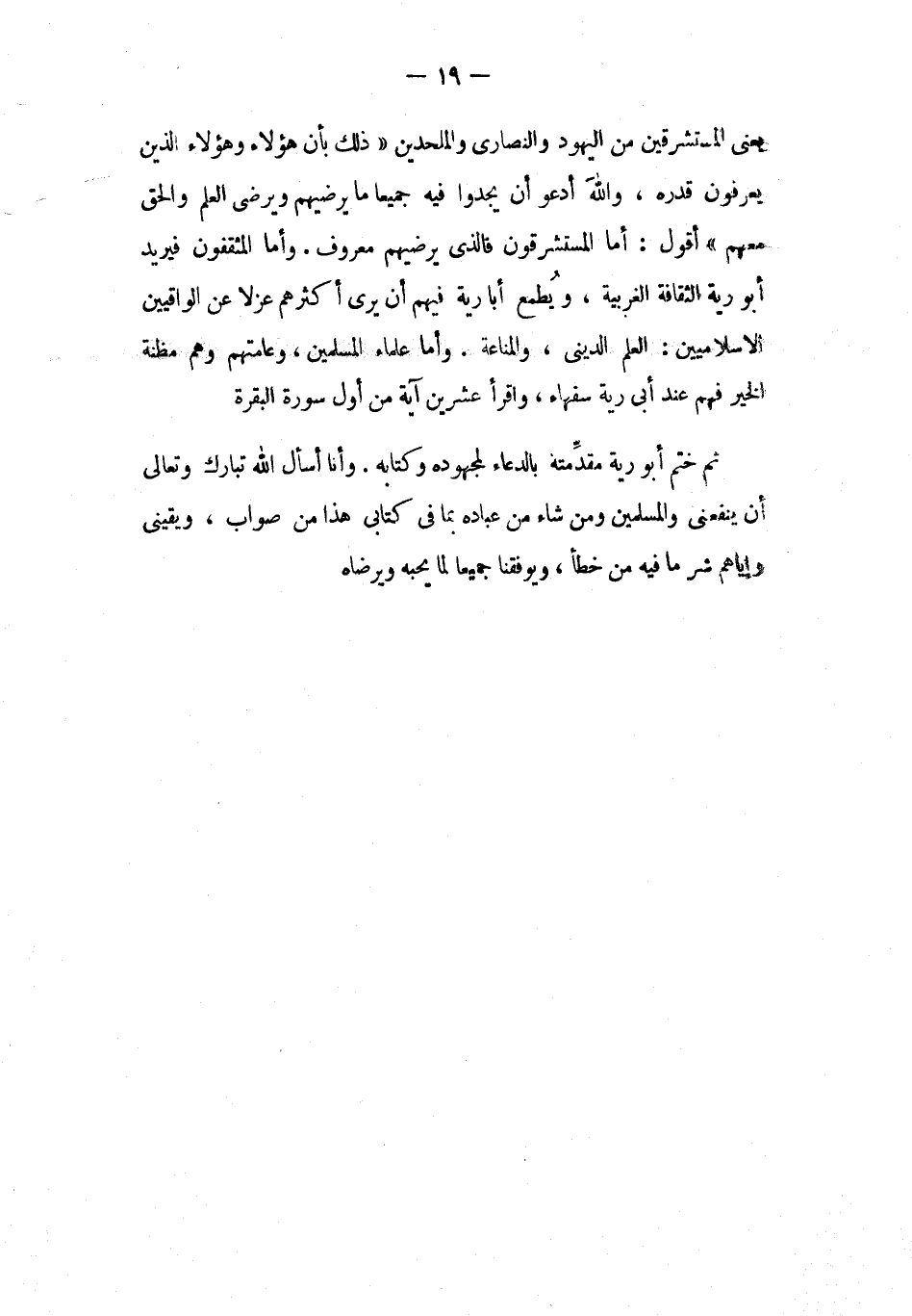 أقول: أما المستشرقون فالذي يرضيهم معروف. وأما المثقفون فيريد أبو رية الثقافة الغربية، ويطمع أبا رية فيهم أن يرى أكثرهم عزلاً عن الواقيين الاسلاميين: العلم الديني، والمناعة. وأما علماء المسلمين، وعامتهم وهم مظنة الخير فهم عند أبي رية سفهاء، واقرأ عشرين آية من أول سورة البقرة