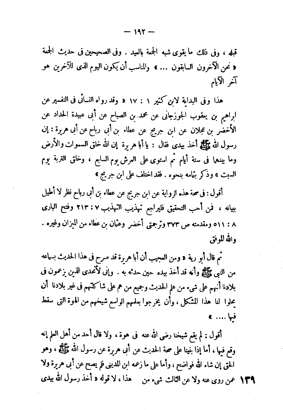 هذا وفي البداية لابن كثير 71:1 «وق أورده النسائي في التفسير عن إبراهيم بن يعقوب الجوزجاني عن محمد بن الصباح بن أبي عبيدة الحداد عن الأخضر بن عجلان عن ابن جريج عن عطاء عن ابن أبي رباح عن أبي هريرة: إن رسول الله صلى الله عليه وسلم أخذ بيدي فقال: يا أبا هريرة إن الله خلق السموات والأرض وما بينهما في ستة أيام ثم استوى على العرش يوم السابع، وخلق التربة يوم السبت» وذكر بتمامه بنحوه. فقد اختلف على ابن جريج»