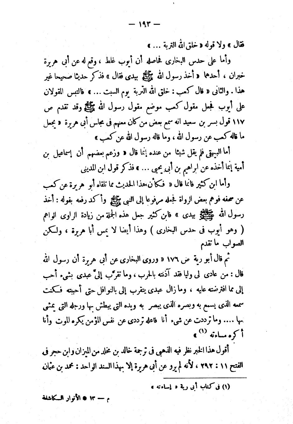 وأما ابن كثير فإنما قال «فكأن هذا الحديث مما تلقاه أبو هريرة عن كعب عن صحفه فوهم بعض الرواه فجعله مرفوعاً إلى النبي صلى الله عليه وسلم وأكد رفعه بقوله: أخذ رسول الله صلى الله عليه وسلم بيدي» فابن كثير جعل هذه الجملة من زيادة الراوي الواهم «وهو أيوب في حدس البخاري) وهذا أيضاً لا يمس أبا هريرة، ولكن الصواب ما تقدم