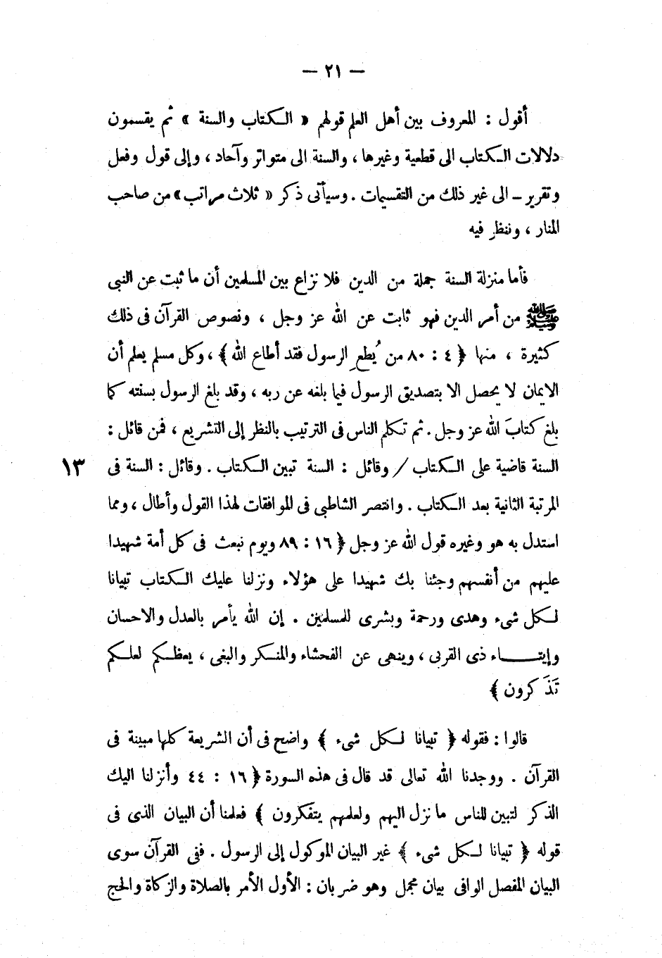فأما منزلة السنة جملة من الدين فلا نزاع بين المسلمين في أن ما ثبت عن النبي صلى الله عليه وسلم من أمر الدين فهو ثابت عن الله عز وجل، ونصوص القرآن في ذلك كثيرة، منها (80:4 من يطع الرسول فقد أطاع الله) وكل مسلم يعلم أن الإيمان لا يحصل إلا بتصديق الرسول فيما بلغه عن ربه، وقد بلغ الرسول بسنته كما بلغ كتاب الله عز وجل.
