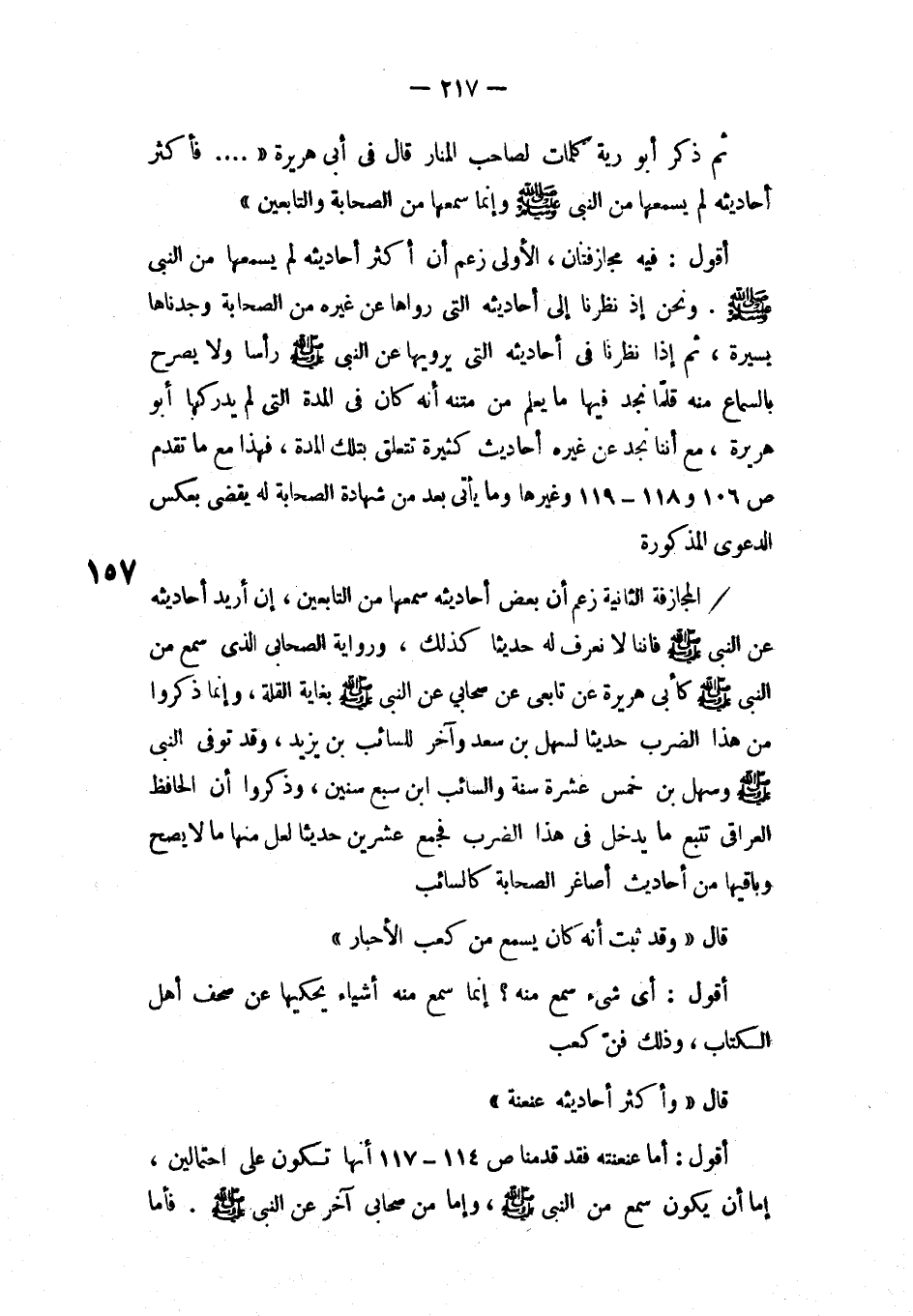 أقول: فيه مجازفتان، الأولى زعم أن أكثر أحاديثه لم يسمها من النبي صلى الله عليه وسلم. ونحن إ ذ نظرنا إلى أحاديثه التي رواها عن غيره من الصحابة وجدناها بسيرة، ثم إذا نظرنا في أحاديثه التي يرويها عن النبي صلى الله عليه وسلم رأسا ولا يصرح بالسماع منه قلماً نجد فيها ما يعلم من متنه أنه كان في المدة التي لم يدركها أبو هريرة، مع أننا نجد عن غيره أحاديث كثيرة تتعلق بتلك المادة، فهذا مع ما تقدم ص106و 118و 119 وغيرها وما يأتي بعد من شهادة الصحابة له يقضي بعكس الدعوى المذكورة