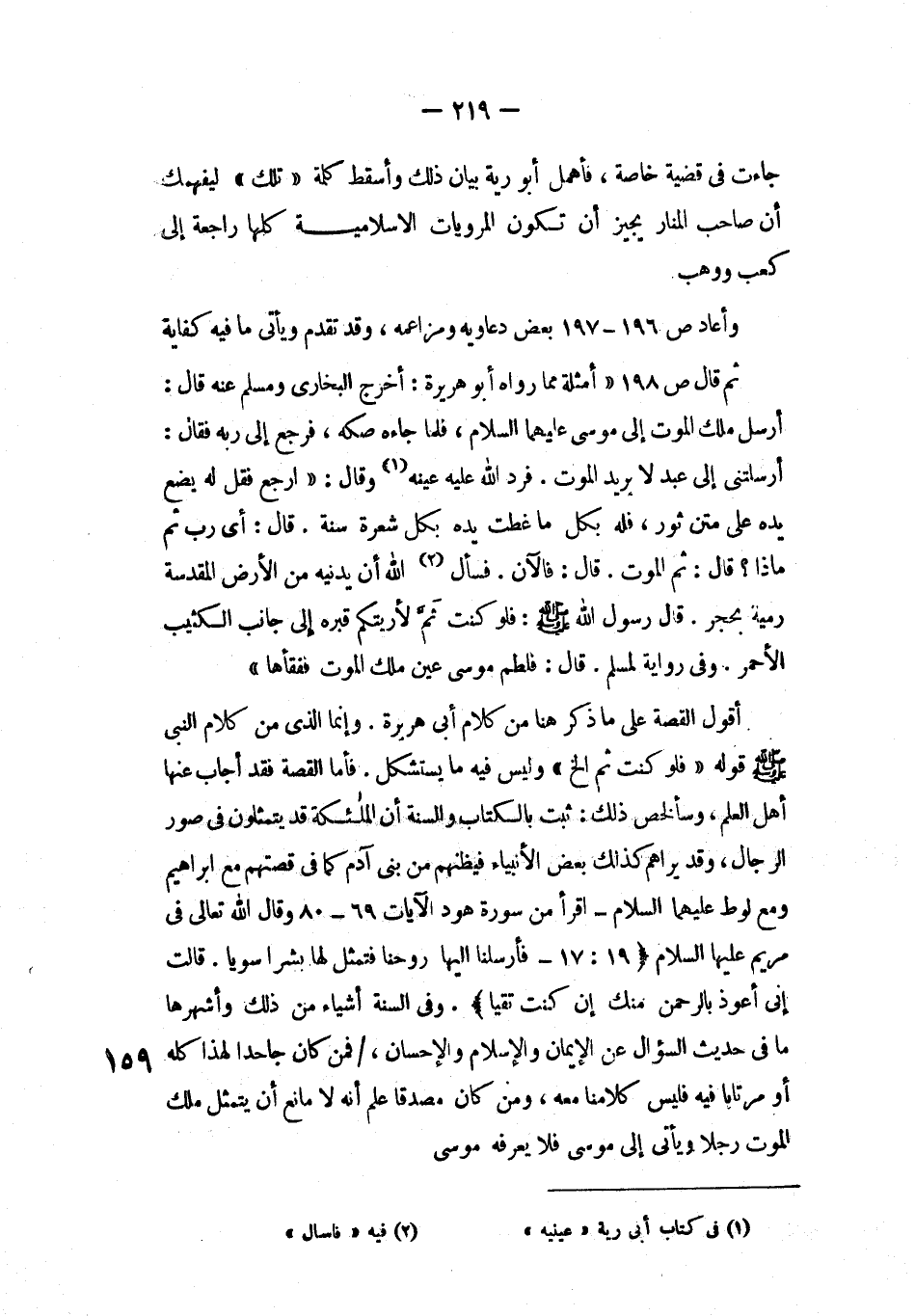 ثم قال ص 198 «أمثله مما رواه أبو هريرة: أخرج البخاري ومسلم عنه قال: أرسل مالك الموت إلى موسى عليهما السلام، فلما جاءه صكة، فرجع إلى ربه فقال: أرسلتني إلى عبد لا يريد الموت. فرد الله عليه عينه [في كتاب أبي رية «عينيه» وقال: ارجع فقل له بضع يده على متن ثور، فله بكل ما غطت يده بكل شعرة سنة. قال: أي رب ثم ماذا؟ قال: ثم الموت. قال: فالآن. فسأل [فيه «فأسأل» الله أن يدنيه من الأرض المقدسة رمية بحجر. قال رسول الله صلى الله عليه وسلم: فلو كنت ثم لأريكم قبره إلى جانب الكثيب الأحمر. وفي رواية لمسلم. قال: فلطم موسى عين مالك الموت ففقأها»