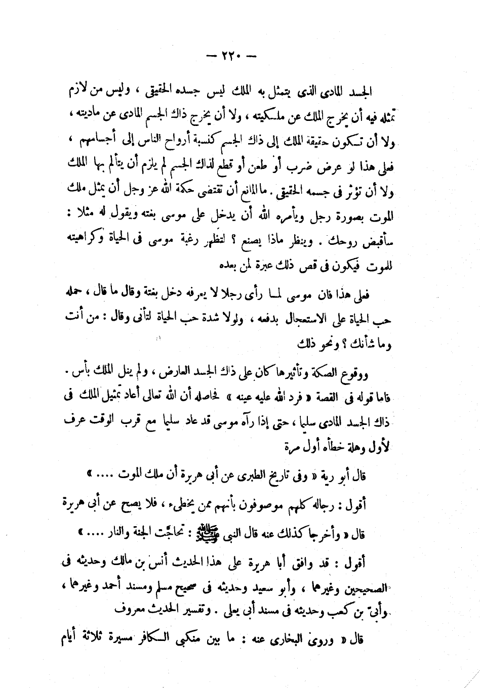 ووقوع الصكة وتأثيرها كان على ذاك الجسد العارض، ولم ينل الملك بأس. فأما قوله في القصة «فرد الله عليه عينه» فحاصله أن الله تعالى أعاد تمثيل الملك في ذاك الجسد المادي سليماً، حتى إذا رآه موسى قد عاد سليماً مع قرب الوقت عرف لأول وهلة خطأه أول مرة.