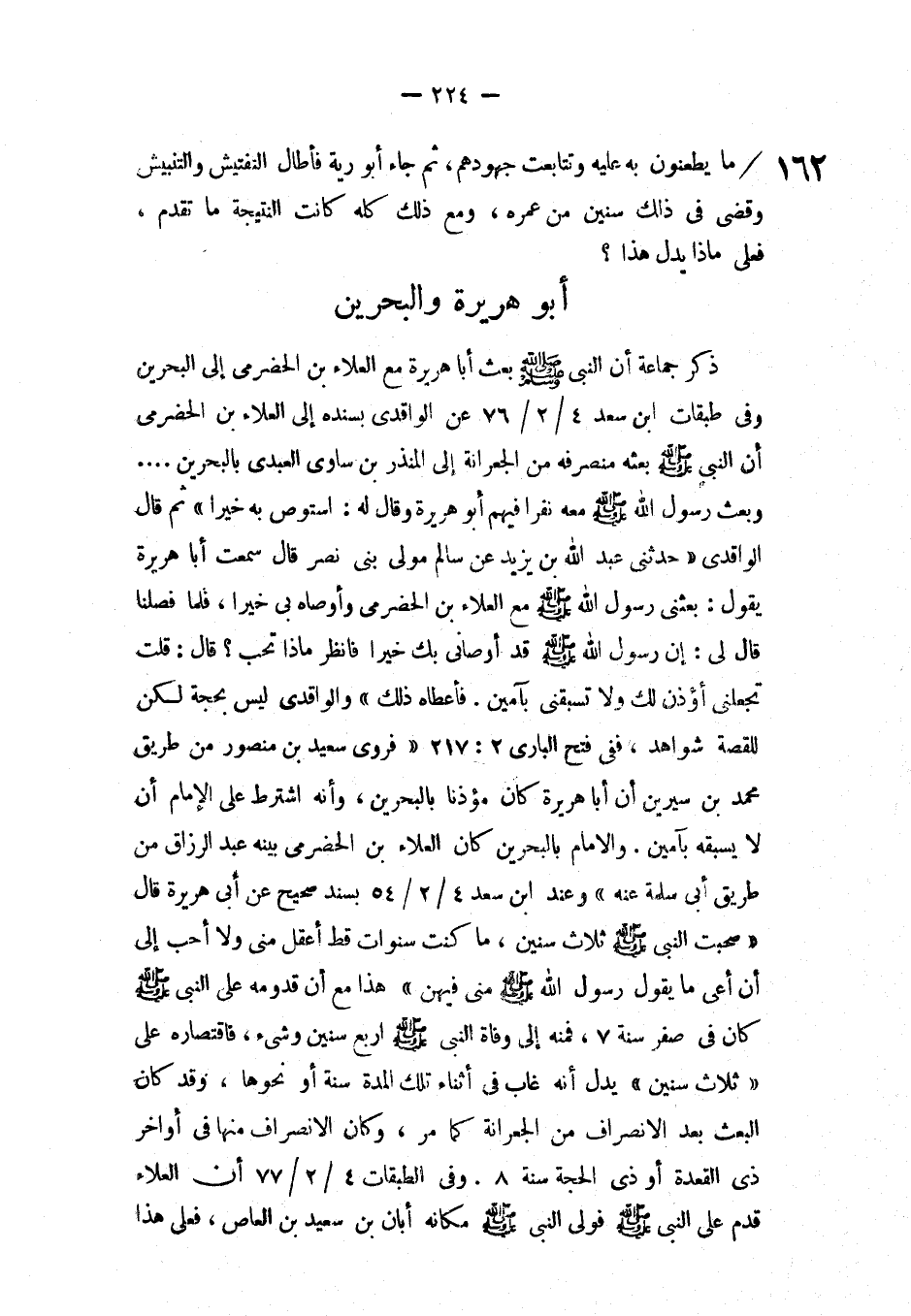 ذكر جماعة أن النبي صلى الله عليه وسلم بعث أبا هريرة مع العلاء بن الحضرمي إلى البحرين وفي طبقات ابن سعد 4/2/76 عن الواقدي بسنده إلى العلاء بن الحضرمي أن النبي صلى الله عليه وسلم بعثه منصرفه من الجعرانة إلى المنذر بن ساوى العبدين بالبحرين ... وبعث رسول الله صلى الله عليه وسلم معه نفراً فيهم أبو هريرة وقال له: استوص به خيراً» ثم قال الواقدي «حدثني عبد الله بن يزيد عن سالم مولى نبي نضر قال سمعت أبا هريرة يقول: بعثني رسول الله صلى الله عليه وسلم مع العلاء بن الحضرمي وأوصاني به خيراً، فلما فصلنا قال لي: إن رسول الله صلى الله عليه وسلم قد أوصاني بك خيراً فانظر ماذا تحب؟ قال: قلت تجعلني أؤذن لك ولا تسبقني بآمين، فأعطاه ذلك» والواقدي ليس بحجة لكن للقصة شواهد، ففي فتح الباري 217:2 «فروى سعيد بن منصور من طريق محمد بن سيرين أن أبا هريرة كان مؤذناً بالبحرين، وأنه اشترط على الإمام أن لا يسبقه بآمين. والإمام بالبحرين كان العلاء بن الحضرمي بينه عبد الرزاق من طريق أبي سلمة عنه» وعند ابن سعد 4/2/54 بسند صحيح عن أبي هريرة قال «صحبت النبي صلى الله عليه وسلم ثلاث سنين، ما كنت سنوات قط أعقل مني ولا أحب إلي أن أعي ما يقول رسول الله صلى الله عليه وسلم مني فيهن» هذا مع أن قدومه على النبي صلى الله عليه وسلم كان في صفر سنة 8، فمنه إلى وفاة النبي صلى الله عليه وسلم أربع سنين وشيء فاقتصاره على «ثلاث سنين» يدل أنه غالب في أثناء المدة سنة أو نحوها، وقد كان البعث بعد الانصراف من الجعران كما مر، وكان الانصراف منها في أواخر ذي القعدة أو ذي الحجة سنة8، وفي الطبقات 4/2/77 أن العلاء قدم على النبي صلى الله عليه وسلم فولى النبي صلى الله عليه وسلم مكانه أبان بن سعيد بن العاص، فعلى هذا