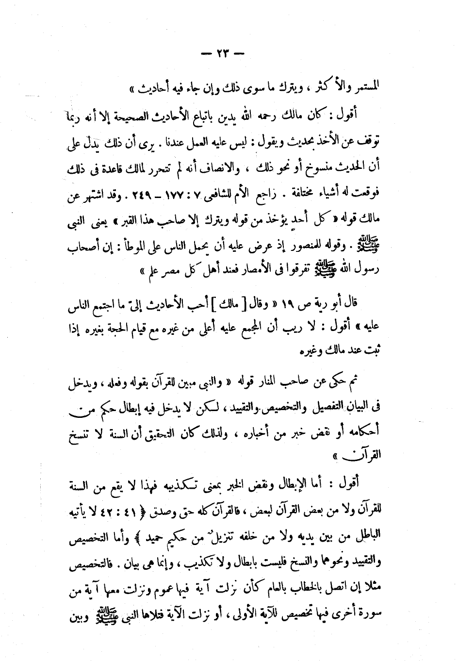 والانصاف أنه لم يتحرر لمالك قاعدة في ذلك فوقعت له أشياء مختلفة. راجع الأم للشافعي 177:7 - 249. وقد اشتهر عن مالك قوله «كل أحدٍ يؤخذ من قوله ويترك إلا صاحب هذا القبر» يعني النبي صلى الله عليه وسلم. وقوله للمنصور إذ عرض عليه أن يحمل الناس على الموطأ: إن أصحاب رسول الله صلى الله عليه وسلم تفرقوا في الأمصار فعند أهل كل مصر علم»