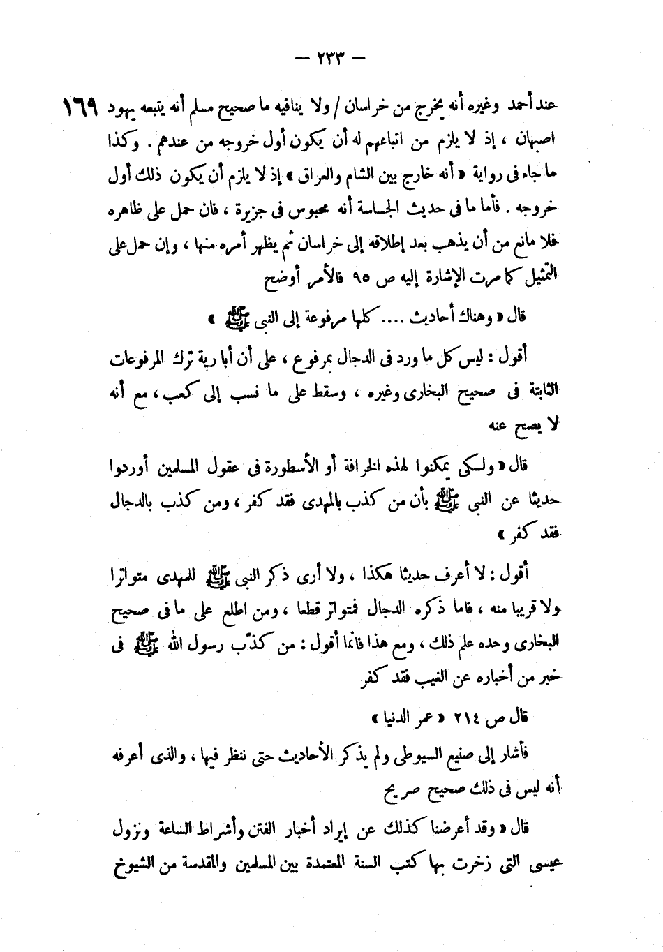 قال «وقد أعرفنا أعرضنا كذلك عن إيراد أخبار الفتن وأشراط الساعة ونزول عيسى التي زخرت بها كتب السنة المعتمدة بين المسلمين والمقدسة من الشيوخ
