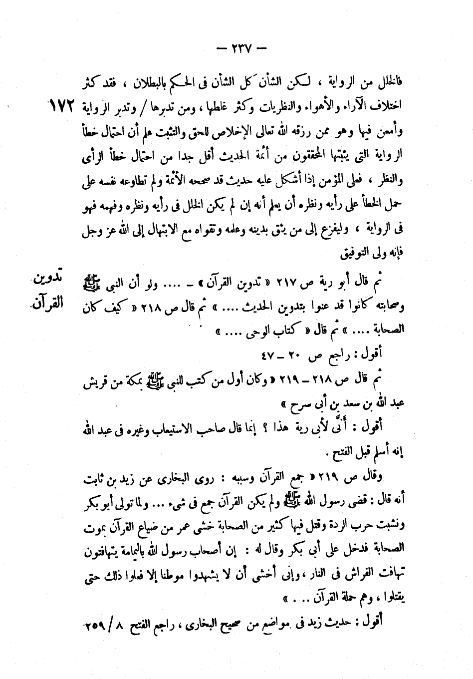 وقال ص219 «جمع القرآن وسببه: روى البخاري عن زيد بن ثابت أنه قال: قضى رسول الله صلى الله عليه وسلم ولم يكن القرآن جمع في شيء ... ولما تولى أبا بكر ونشبت حرب الردة وقتل فيها كثير من الصحابة خشي عمر من ضياع القرآن بموت الصحابة فدخل على أبي بكر وقال له: إن أصحاب رسول الله باليمامة يتهافتون تهافت الفراش في النار، وإني لأخشى أن لا يشهدوا موطناً إلا فعلوا ذلك حتى يقتلوا، وهم حملة القرآن..»