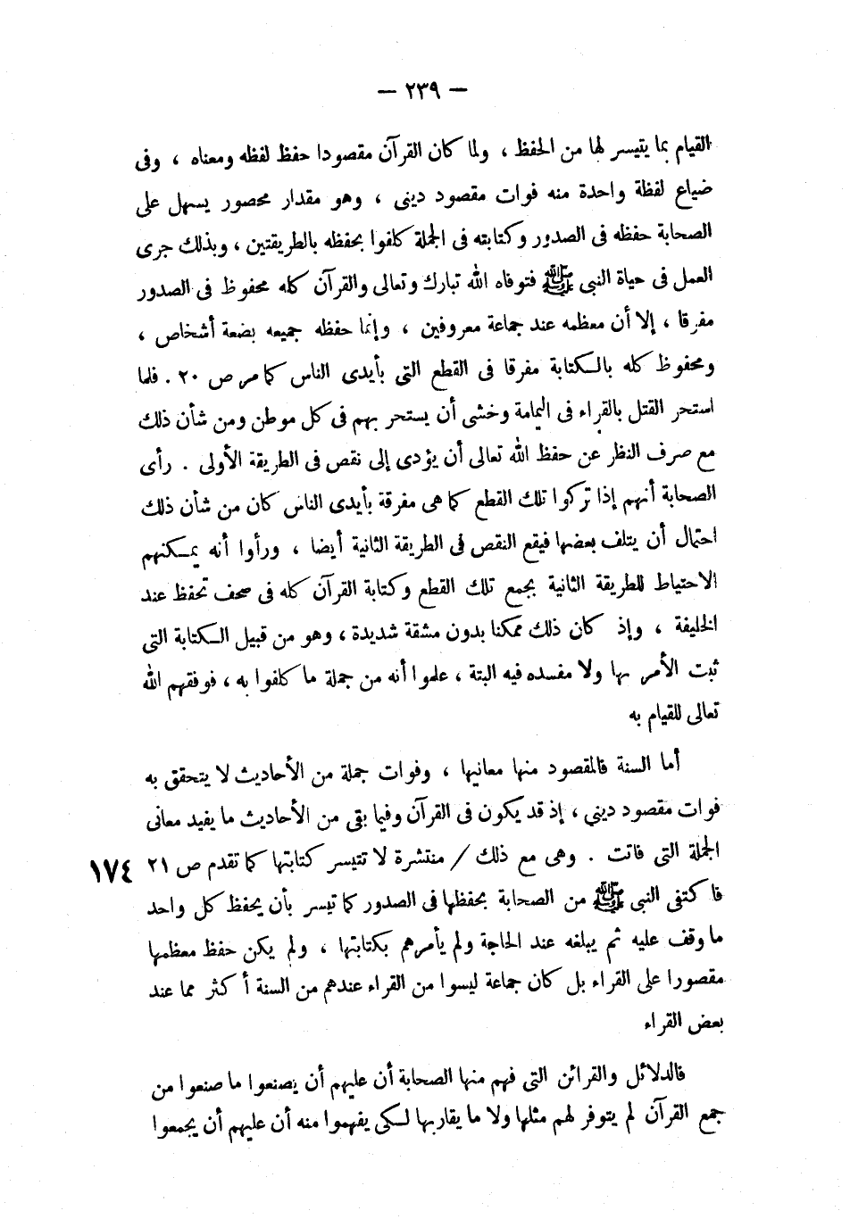القيام بما تيسر لها من الحفظ، ولما كان القرآن مقصوداً حفظ لفظه ومعناه، وفي ضياع لفظة واحدة منه فوات مقصود ديني، وهو مقدار محضور يسهل على الصحابة حفظه في الصدور وكتابته في الجملة كلفوا بحفظه بالطريقتين، وبذلك جرى العمل في حياة النبي صلى الله عليه وسلم فتوفاه الله تبارك وتعالى والقرآن كله محفوظ في الصدور مفرقا، إلا أن معظمه عند جماعة معروفين، وإنما حفظه جميعه بضعة أشخاص، ومحفوظ كله بالكتابة مفرقاً في القطع التي بأيدي الناس كم مر ص20. فلما استحر القتل بالقراء في اليمامة وخشي أن يستحر بهم في كل موطن ومن شأن ذلك مع صرف النظر عن حفظ الله تعالى أن يؤدي إلى نقص في الطريقة الأولى. رأى الصحابة أنهم إذا تركوا تلك القطع كما هي مفرقة بأيدي الناس كان من شأن ذلك احتمال أن يتلف بعضها فيقع النقص في الطريقة الثانية أيضاً. ورأوا أنه يمكنهم الاحتياط للطريقة الثانية بجمع تلك القطع وكتابة القرآن كله في صحف تحفظ عند الخليفة، وإذ كان ذلك ممكنا بدون مشقة شديدة، وهو من قبيل الكتابة التي ثبت الأمر بها ولا مفسدة البتة، علموا أنه من جماعة ما كلفوا به، فوفقهم الله تعالى للقيام بهذا