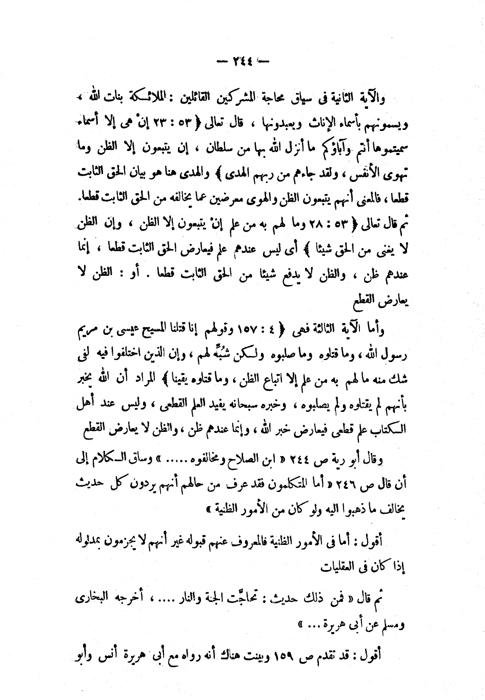 وقال أبو رية ص244 «ابن الصلاح ومخالفوه ... » وساق الكلام إلى أن قال 246 «أما المتكلمون فقد عرف من حالهم أنهم يردون كل حديث يخالف ما ذهبوا إليه ولو كان من الأمور الظنية»
