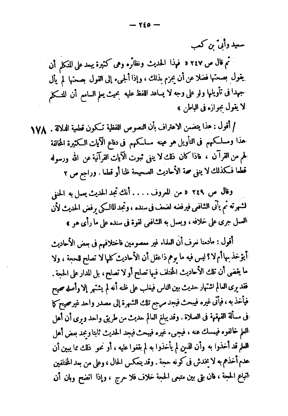 وقال ص249 «من المعروف. أنك تجد الحديث يعمل به الحنفي لشهرته ثم يأتي الشافعي فيرفضه لضعف في سنده، وتجد المالكي يرفض الحديث لأن العلم جلى على خلافه، ويعمل به الشافعي لقوة في سنده على ما رأى هو»