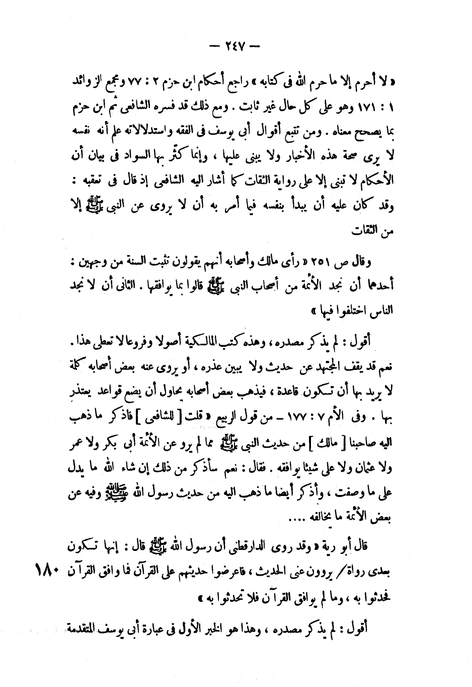 «لا أحرم إلا ما حرم الله كتابه» راجع أحكام ابن حزم 77:2 ومجمع الزوائد 171:1 وهو على كل حال غير ثابت، ومع ذلك قد فسره الشافعي ثم ابن حزم بما يصحح معناه، ومن تتبع أقوال أبي يوسف في الفقة والاستدلالاته على أنه نفسه لا يرى صحة هذه الأخبار ولا يبني عليها، وإنما كثر بها السواد في بيان أن الأحكام لا تبنى إلا على رواية الثقات كما أشار إليه الشافعي إذ قال في تعقبه: وقد كان عليه أن يبدأ بنفسه فيما أمر به أن لا يروي عن النبي صلى الله عليه ولسم إلا من الثقات