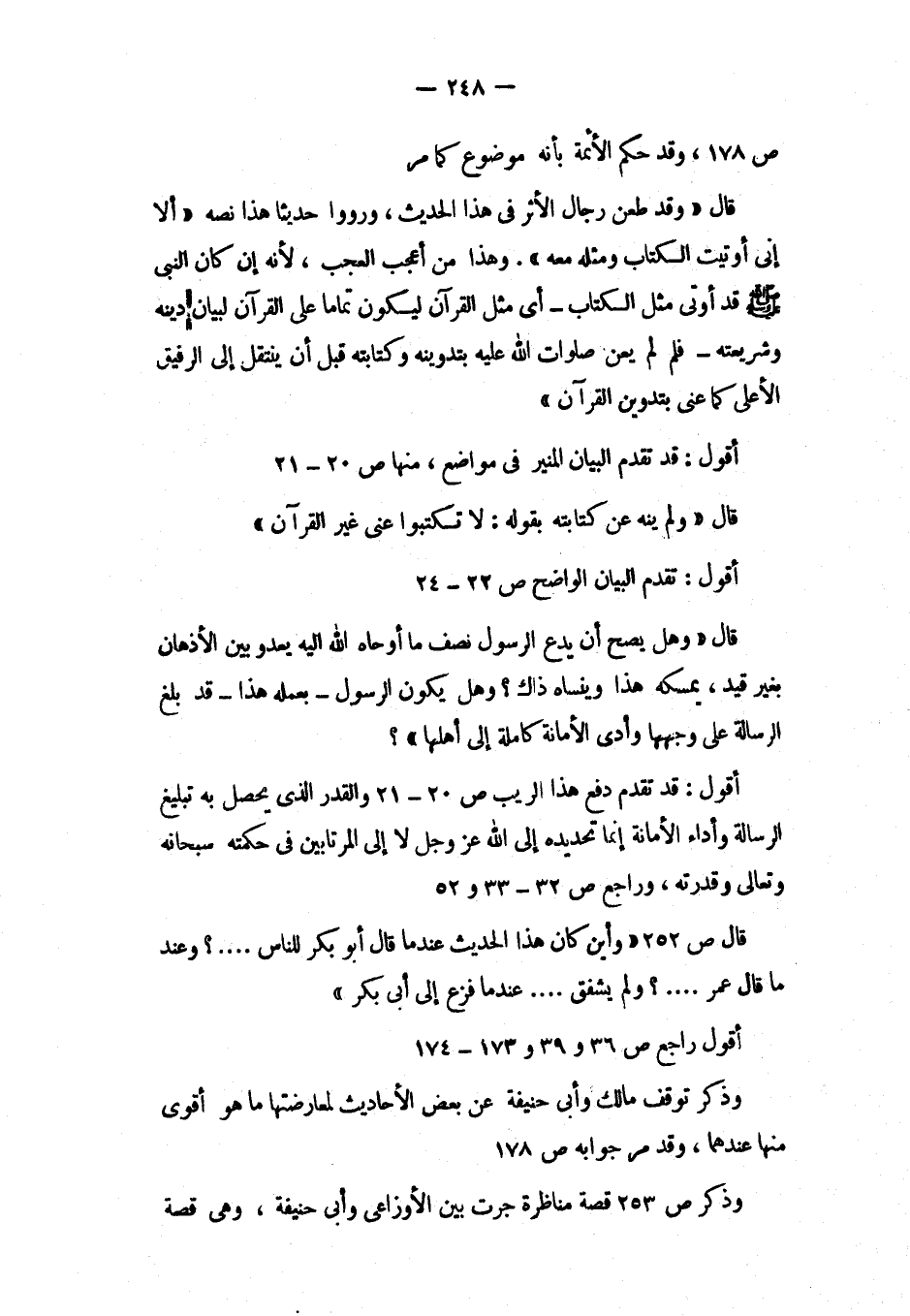 قال «وقد طعن رجال الأثر في هذا الحديث، ورووا حديثاً هذا نصه «ألا إني أوتيت الكتاب ومثله معه» وهذا من أعجب العجب، لأنه إن كان النبي صلى الله عليه وسلم قد أوتي الكتاب- أي مثل القرآن ليكون تماماً على القرآن لبيان دينه وشريعته فلم لم يعن صلوات الله عليه بتدوينه وكتابته قبل أن ينظر إلى الرفيق الأعلى كما عني بالقرآن»