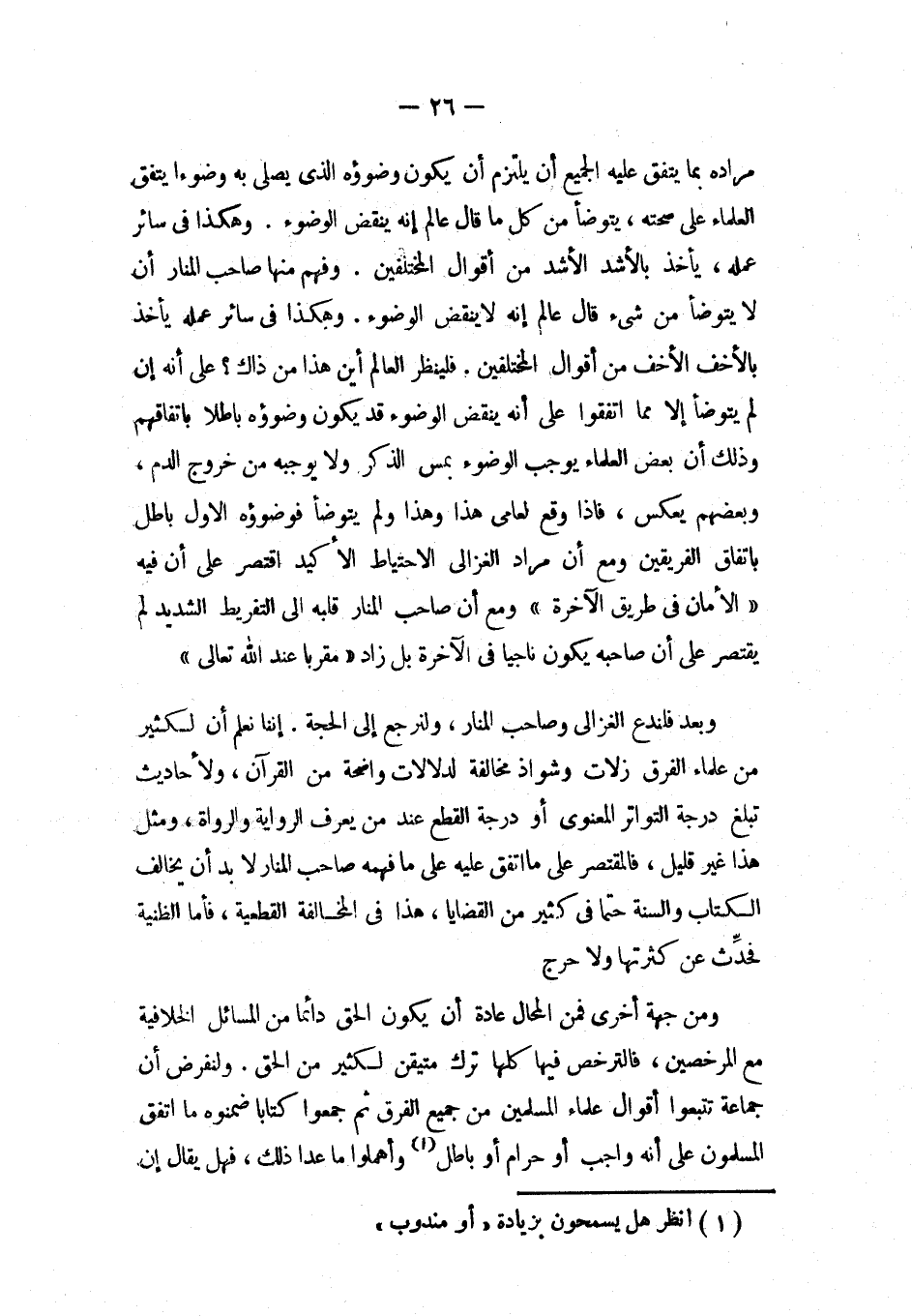 على أنه إن لم يتوضأ إلا بما اتفقوا على أنه قد ينقض الوضوء قد يكون وضوؤه باطلاً بإتفاقهم وذلك أن بعض العلماء يوجب الوضوء بمس الذكر ولا يوجبه من خروج الدم، وبعضهم يعكس، فإذا وقع لعامي هذا وهذا ولم يتوضأ فوضوؤه الأول باطل باتفاق الفريقين ومع أن مراد الغزالي الاحتياط الأكيد اقتصر على أن فيه «الأمان في طريق الآخرة» ومع أن صاحب المنار قلبه على التفريط الشديد لم يقتصر على أن صاحبه يكون ناجياً في الآخرة بل زاد «مقربا ً عند الله تعالى»
