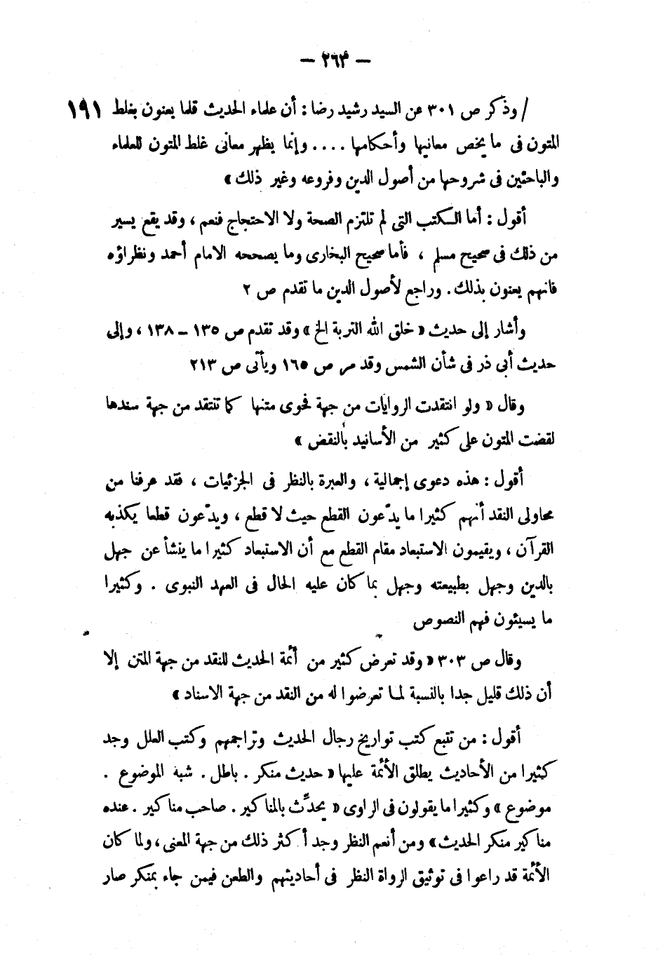 / وذكر ص 301 عن السيد رشيد رضا: أن علماء الحديث قلماً يعنون بغلط المتون ما يخص معانيها وأحكامها.. وإنما يظهر معاني غلط المتون للعلماء والباحثين في شروحها من أصول الدين وفروعه وغير ذلك»