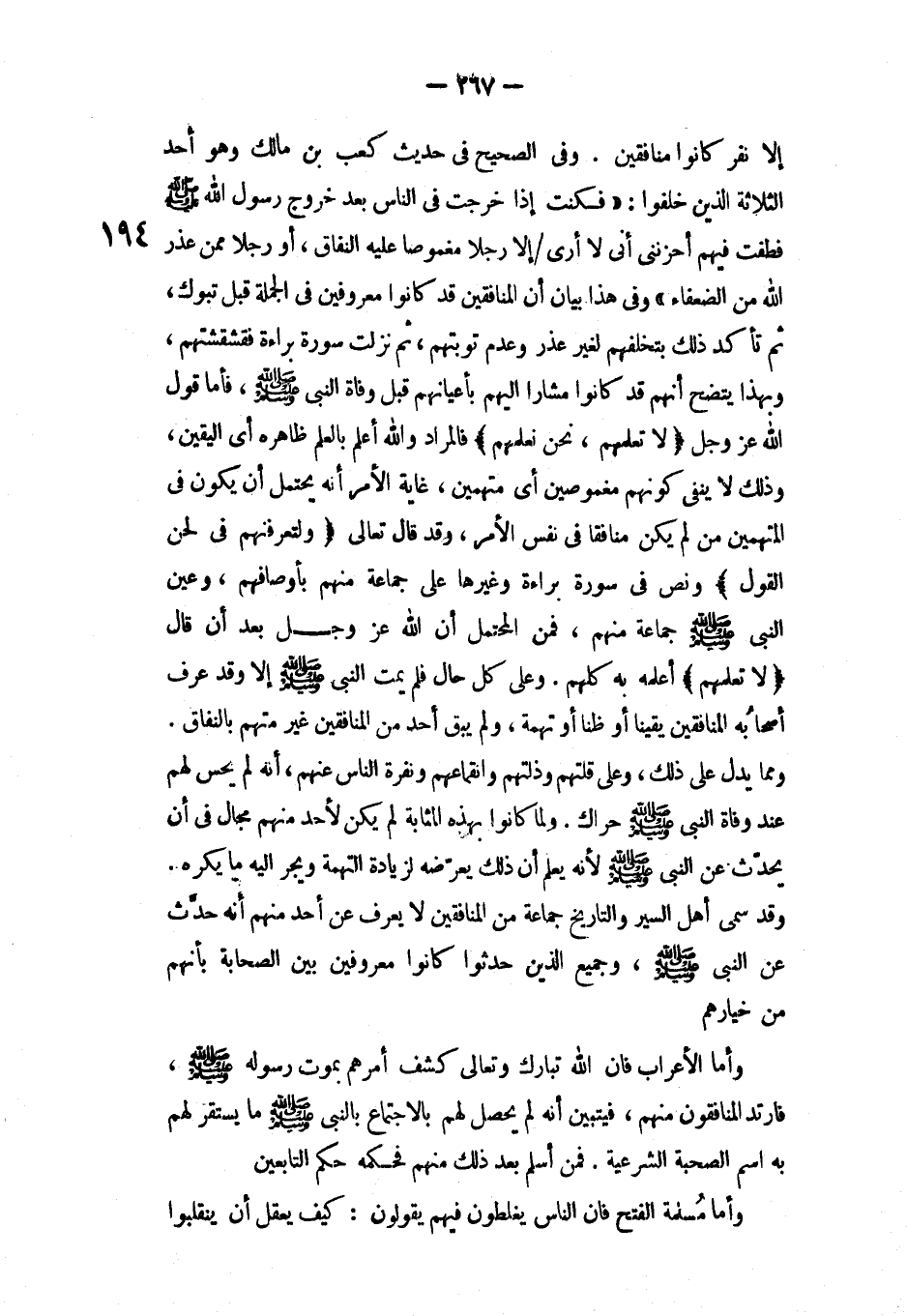 كانوا منافقين. وفي الصحيح في حديث كعب بن مالك وهو أحد الثلاثة الذين خلفوا: «فكنت إذا خرجت إلى الناس بعد خروج رسول الله صلى الله عليه وسلم فطفت فيهم أحزنني أني لا أرى / إلا رجلاً مغموصاً عليه النفاق، أو رجلاً ممن عذر الله من الضعفاء» وفي هذا بيان أن المنافقين قد كانوا معروفين في الجملة قبل تبوك، ثم تأكد ذلك بتخلفه لغير عذر وعدم ثبوبتهم، ثم نزلت سورة براءة فقشقشتهم وبهذا يتضح أنهم قد كانوا مشاور إليهم بأعيانهم قبل وفاة النبي صلى الله عليه وسلم فأما قول الله عز وجل (لا تلعمهم، نحن نعلمهم) فالمراد والله أعلم بالعلم ظاهره أي باليقين، وذلك لا ينفي كونهم مغموصين أي متهمين، غاية الأمر أنه يحتمل أن يكون في المتهمين من لم يكن