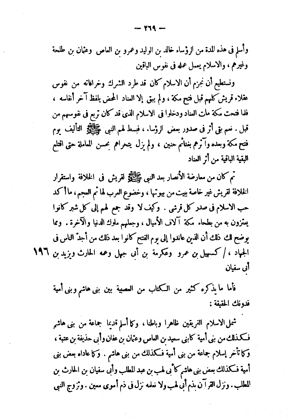 شمل الإسلام الفريقين ظاهراً وباطناً، وكما أسلم قديماً جماعة من بني هاشم فكذلك من بني أمية كابني سعيد بن العاص وعثمان بن عفان وأبي حذيفة بن عتبة، وكما تأخر الإسلام جماعة من بني أمية فكذلك من بني هاشم، وكما عاداه بعض بني أمية فكذلك بعض بني هاشم كأبي لهب بن عبد المطلب وأبي سفيان بن الحارث بن المطلب، ونزل القرآن يذم أبي لهب ولا نعلمه نزل في ذم أموي معين، وتزوج النبي