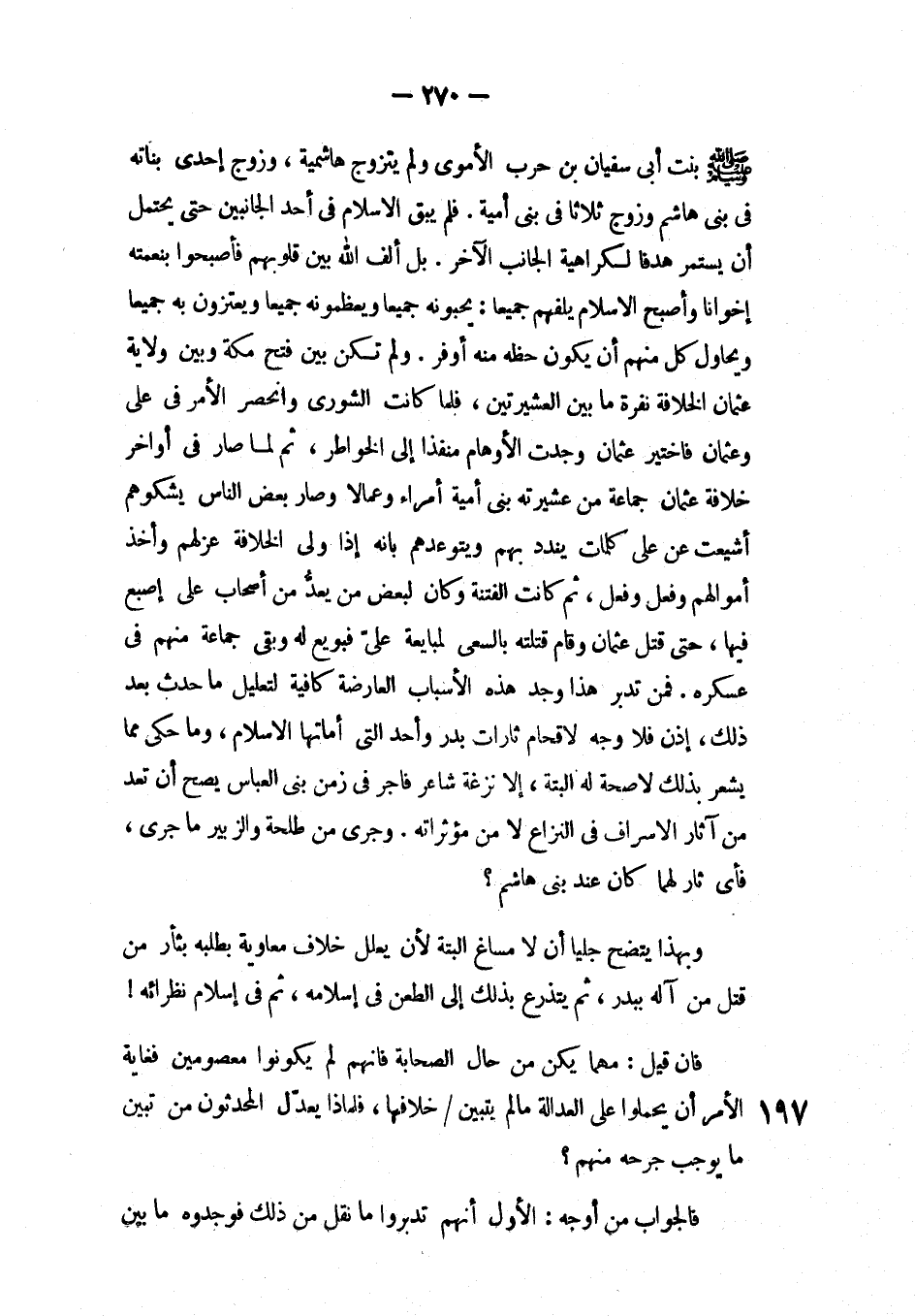 صلى الله عليه وسلم بنت أبي سفيان بن حرب الأموي ولم يتزوج هاشمية، وزوج إحدى بناته في بني هاشم وزوج ثلاثاً في بني أمية، فلم يبق الإسلام في أحد الجانبين حتى يحتمل أن يستمر هدفاً لكراهية الجانب الآخر. بل ألف الله قلوبهم فأصبحوا بنعمتة إخوانا وأصبح الإسلام يلفهم جميعاً: يحبونه جميعاً ويعظمونه جميعاً ويعتزون به جميعاً ويحاول كل منهم أن يكون حظه منه أوفر، ولم تكن بيين فتح مكة وبين ولاية عثمان الخلافة تفرد ما بين العشيرتين، فلما كانت الشورى وانحصر الأمر في علي وعثمان فاختير عثمان وجدت الأوهام منقذاً إلى الخواطر ثم لما صار في أواخر خلافة عثمان جماعة من عشيرته بني أمية وعمالاً وصار بعض الناس يشكوهم أشيعت عن علي كلمات يندد بهم ويتوعدهم بإنه إذا ولى خلافة عزلهم وأخذ أموالهم وفعل وفعل، ثم كانت الفتنة وكان لبعض من يعد من أصحاب على إصبع فيها، حتى قتل عثنمان وقام قلتلته بالسعي لمبايعة علي فبويع علي وبقي جماعة منهم في عسكره، فمن تدبر هذا وجد هذه الأسبباب العارضة كافية لتعليل ما حدث بعد ذلك، إذن فلا وجه لاقحام ثارات بدر وأحد التي أماتها الإسلام وما حكى مما يشعر بذلك لا صحة له البتة، إلا نزعة شاعر فاجر في زمن بني العباس يصح أن تعد من آثار الاسراف في النزاع لا من مؤثراته، وجرى من طلحة والزبير ما جرئ فأي ثار لهما كان عند بني هاشم؟