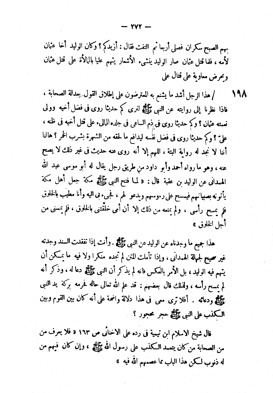 هذا جميع ما وجدناه عن الوليد عن النبي صلى الله عليه وسلم وأنت إذا تفقدت السند وجدته غير صحيح لجهالة الهمداني، وإذا تأملت المتن لم تجده منكراً ولا فيه ما يمكن أ، يتم فيه الوليد، بل الأمر بالعكس فإنه لم يذكر النبي صلى الله عليه وسلم دعا له، وذكر أنه لم يمسح رأسه، ولذلك قال بعضهم: قد علم الله تعالى حاله فحرمه بركة يد النبي صلى الله عليه وسلم ودعائه. أفلا ترى معي في هذا دلالة واضحة على أنه كان بين القوم وبين الكذب على النبي صلى الله عليه وسلم حجر محجور؟