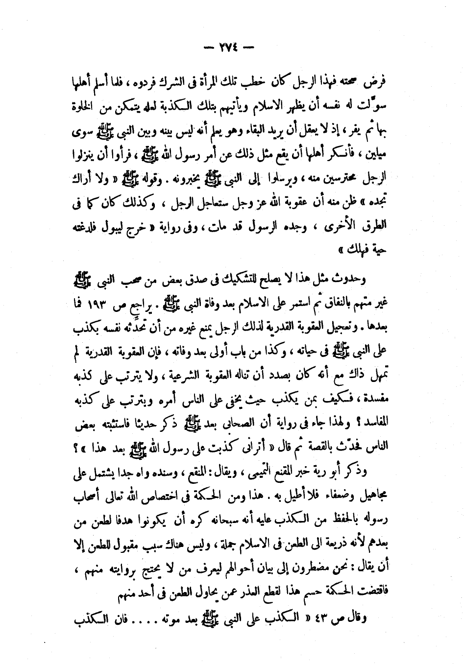 وحدوث مثل هذا لا يصلح للتشكيك في صدق بعض من صحب النبي صلى الله عليه وسلم غير متهم بالنفاق ثم استمر على الإسلام بعد وفاة النبي صلى الله عليه وسلم. يراحع ص13 فما بعدها، وتعجيل العقوبة القدرية لذلك الرجل يمنع غيره من أن تحدثه نفسه بكذب على النبي صلى الله عليهوسلم في حياته، وكذا من باب أولى بعد وفاته، فإن العقوبة القدرية لم تمهل ذاك مع أنه يصدد أن تناله العقوبة الشرعية، ولا يترتب على كذبه المفاسد؟ ولهذا جاء في رواية أن الصحابي بعد صلى الله عليه وسلم ذكر حديثاً فاستثبته بعض الناس فحدث بالقصة ثم قال «أتراني كذبت على رسول الله صلى الله عليه وسلم بعد هذا» ؟