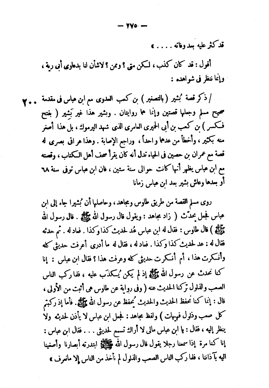 روى مسلم قصة من طريق طاوس ومجالد، وحاصلها أن بشيراً جاء إلى ابن عباس فجعل يحدث (زاد مجاهد: ويقول قال رسول الله صلى الله عليهوسلم. قال رسول الله صلى الله عليه وسلم) قال طاوس: فقال له ابن عباس عد لحديث كذا وكذا، فعاد له. ثم حدثه فقال له: عد لحديث كذا وكذا، فعاد له، فقال له ما أدري أعرفت حديثي كله وأنكرت هذا. أم أنكرت حديثي كله وعرفت هذا؟ فقال ابن عباس: إنا كنا نحدث عن رسول الله صلى الله عليه وسلم إذ لم يكن يكذب عليه. فلما ركب الناس الصعب والذلول تركنا الحديث عنه (وفي رواية طاوس هي أثتب عن الأولى، قال: إنا كنا نحف الحديث والحديث يحفظ عن رسول الله صلى الله عليه وسلم. فأما إذ ركبتم كل صعف وذلول فهيهات) ولفظ مجاهد: فجعل اب عباس لا يأذن لحديثه ولا ينظر إليه، فقال: يا ابن عباس مالي لا أراك تسمع لحديثي ... فقال ابن عباس: «إذا كنا مرة إذ سمعنا رجلاً يقول قال رسول الله صلى الله عليه وسلم ابتدرته أبصارنا وأصغينا إليه بآذاننا، فلما ركب الناس الصعب والذلول لم نأخذ من الناس إلا من نعرف»