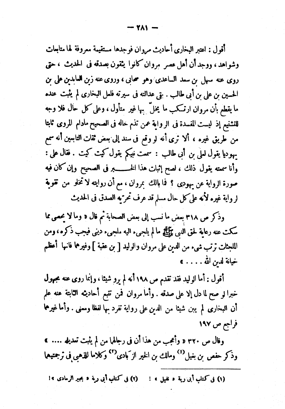 أقول: أما الوليد فقد تقدم ص198 أنه لم يرو شيئاً، وإنما روى عنه مجهول خبراً لو صح لما دل إلا على صدقه، وأما مروان فمن تتبع أحاديثه الثابتة عنه علم أن البخاري لم يبن شيئاً من الدين على رواية تفرد بها لفظاً ومعنى، وأما غيرها فراجع ص197