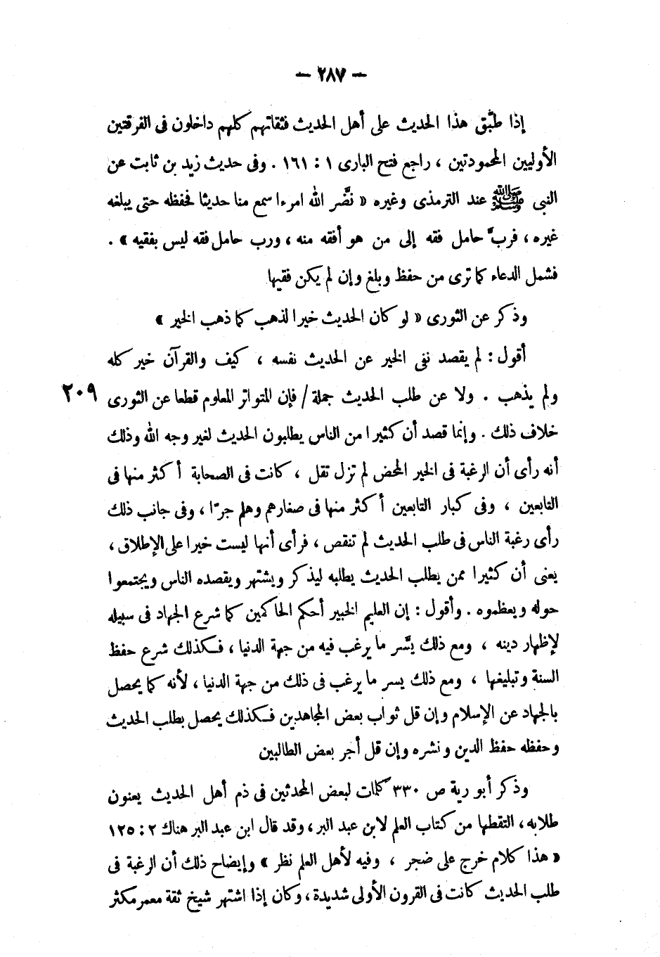 أقول: لم يقصد نفي الخير عن هذا الحديث نفسه، كيف والقرآن خير كله ولم يذهب ولا عن طلب الحديث جملة / فإن المتواتر المعلوم قطعاً عن الثوري خلاف ذلك، وإنما قصد أن كثيراً من الناس يطلبون الحديث لغير وجه الله وذلك أنه رأى أن الرغبة في الخير لمحض لم تزل تقل، كانت في الصحابة أكثر منها في التابعين، وفي كبار التابعين أكثر منها في صغارهم وهلم جرا، وفي جانب ذلك يعني أن كثيراً ممن يطلب الحديث يطلبه ليذكر ويشتهر ويقصده الناس ويجتمعوا حوله ويعظموه. وأقول: إن العليم الخبير أحكام الحاكمين كما شرع الجهاد في سبيله لإظهار دينه، ومع ذلك يسر ما يرغب فيه من جهة الدنيا، فكذلك شرع حفظ السنة وتبليغها، ومع ذلك يسر ما يرغب في ذلك من جهة الدنيا، لأنه كما يحصل بالجهاد عن الإسلام وإن قل ثواب بعض المجاهدين فكذلك يحصل بطلب الحديث وحفظ وحفظ االدين ونشره وإن قل أجر بعض الطالبين
