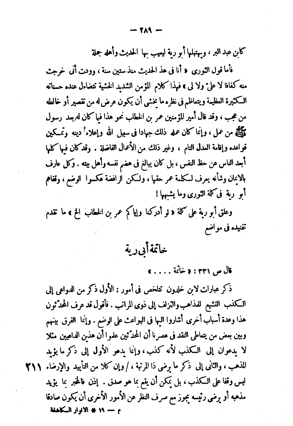 ذكر عبارات لابن خلدون تتلخص في أمور: الأول ذكر من الدواعي إلى الكذب التشيع للمذاهب والتزلف إلى ذوى المراتب. فأقول قد عرف المحدثون هذا وعدة أسباب أخرى أشاروا إليها في البواعث على الوضع، وإنما الفرق بينهم وبين بعض من يتعاطى النقد في عصرنا أن المحدثين علموا أن هذين الداعيين مثلاً لا يدعوان إلى الكذب لأنه كذب، وإنما يدعو الأول إلى ما ذكره ما يؤيد المذهب، والثاني إلى ذكر ما يرضي ذا المرتبة، / وإن كلا من التأييد والإرضاء ليس وقفاً على الكذب، بل يمكن أن يقع بما هو صدق، إذن فالخبر بما يؤيد مذهبه أو يرضي رئيسه يجوز مع تصرف النظر عن الأمور الأخرى أن يكون صادقاً